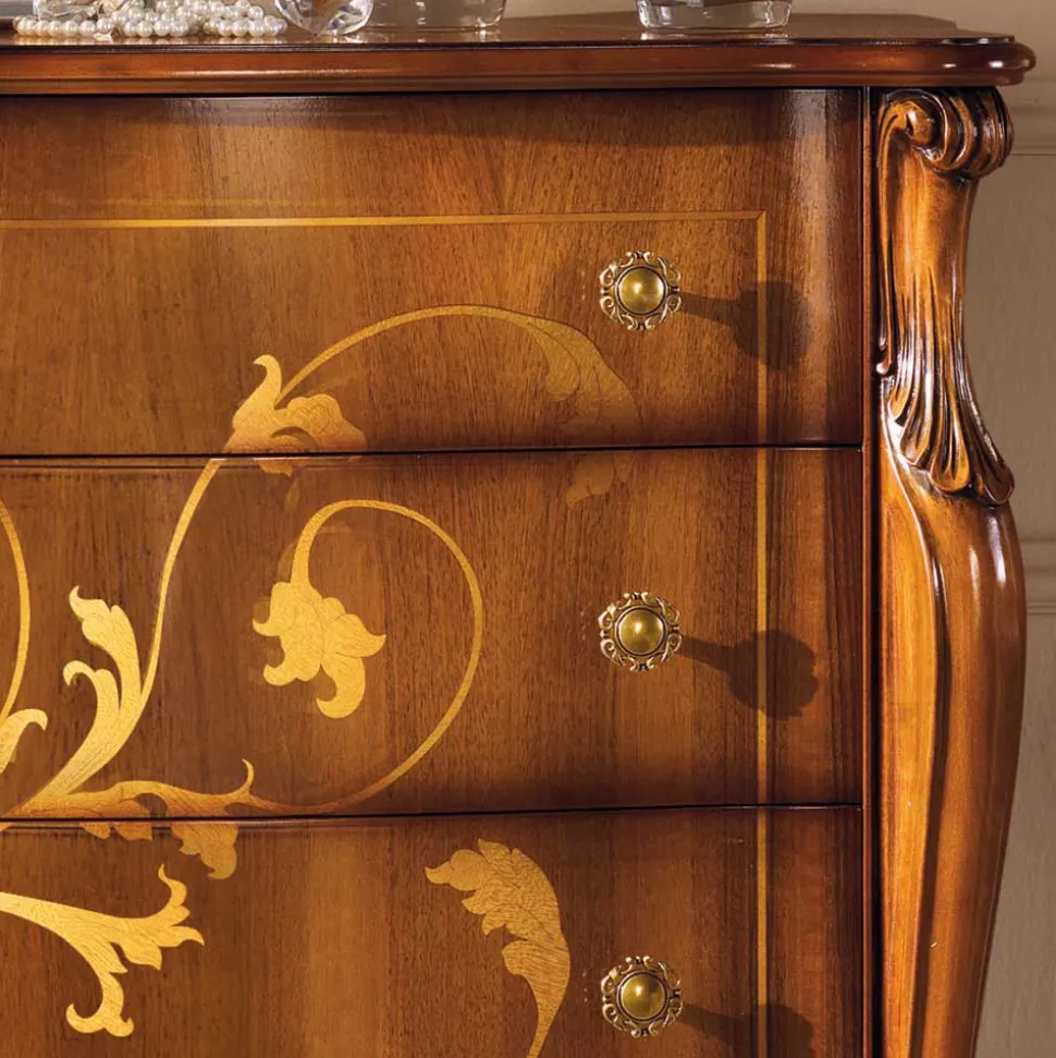 Massive Hölzer (Tulpenbaum, Pappel) sowie robuste Holzwerkstoffe (MDF, Tanne Schichtholz) dienen zur Fertigung der Kommode Carlenna II. Das Pappelholz ist in diesem Zusammenhang im Bereich der Schubladen sowie beim Ranken Motiv auf der Front (Intarsien, Einlegearbeiten) zu finden, während das Tulpenbaum Holz bei den dekorativ beschnitzten Seitenleisten und Schrankbeinen Verwendung findet. Die Deckplatte des Möbelstücks ist aus MDF. Seitenteile und Rückwand werden aus mehrfach verleimtem Tannenholz (Schichtholz) hergestellt. Ein Furnier aus echtem Nussbaum Holz sorgt für ein stimmiges Gesamtbild. Die Oberflächen der Kommode Carlenna II sind zum Schutz und für eine leichte Pflege lackiert. Attraktiv gestaltete Griffknöpfe aus Metall vervollständigen das Möbelstück.