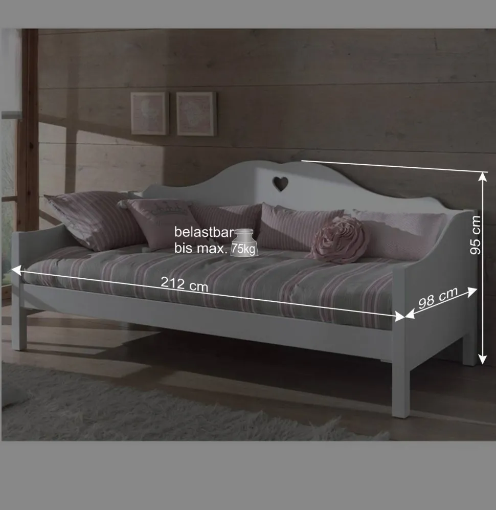Die benötigte Stellfläche des Bettes beträgt 98 cm in der Breite, 95 cm in der Höhe und 212 cm in der Tiefe. Es besteht aus widerstandsfähiger MDF-Platte mit einer lackierten Oberfläche in strahlendem Weiß und hochwertigen Metallbeschlägen.