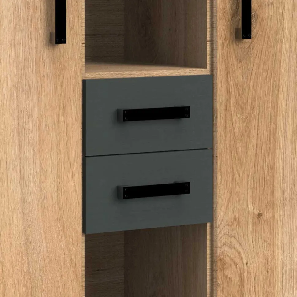Die Möbel sind aus Spanplatte gefertigt und mit einer Folierung in Plankeneiche Dekor und Dunkelgrau versehen. Metallteile sind in Dunkelgrau oder Schwarz pulverbeschichtet, und der Schlafzimmerschrank verfügt über ein Spiegelglas-Element. Robuste Metallbeschläge und Auszüge sorgen für Langlebigkeit und Stabilität.