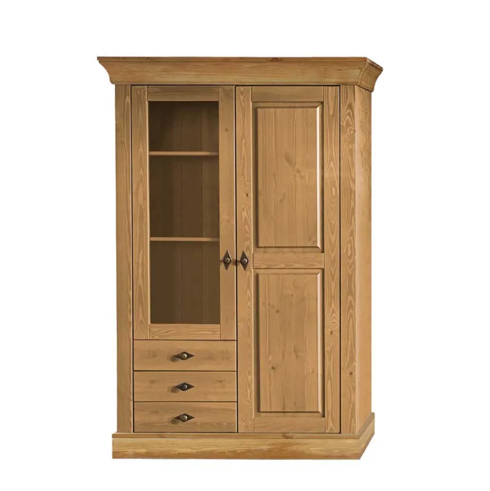 - Mit einer Holztür, einer Glastür und drei Schubladen