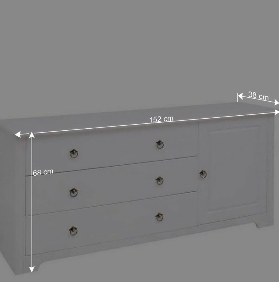 Mit Maßen von 152 cm in der Breite, 68 cm in der Höhe und 38 cm in der Tiefe bietet das Sideboard reichlich Stauraum. Hinter einer Tür mit langlebigen Metallbeschlägen, die für ihre Stabilität und Beständigkeit bekannt sind, verbirgt sich ein geräumiges Fach mit einem verstellbaren Einlegeboden. Drei großzügige Schubkästen auf Metallauszug garantieren eine sanfte und geräuschlose Bedienung. Diese Technik sorgt für eine erhöhte Langlebigkeit und leichtes Gleiten der Schubladen. Ein besonderer Blickfang sind die Metall-Ringgriffe, die dem Sideboard einen zusätzlichen Touch von Eleganz verleihen.
