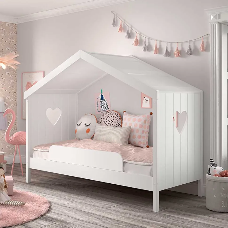 Willkommen im Reich der Träume! Das Kinder Hausbett Grandory aus dem Wohnen.de Shop ist weit mehr als nur ein Bett. Es ist eine außergewöhnliche Schlafstätte, die mit ihren hohen Seitenelementen, dem imposanten Kopfteil und dem hohen Fußteil in geplankter Optik alle Blicke auf sich zieht. Das romantisch-wohnliche Design dieses Bettes wird durch herzförmige Öffnungen im Kopf- und Fußteil perfekt abgerundet.