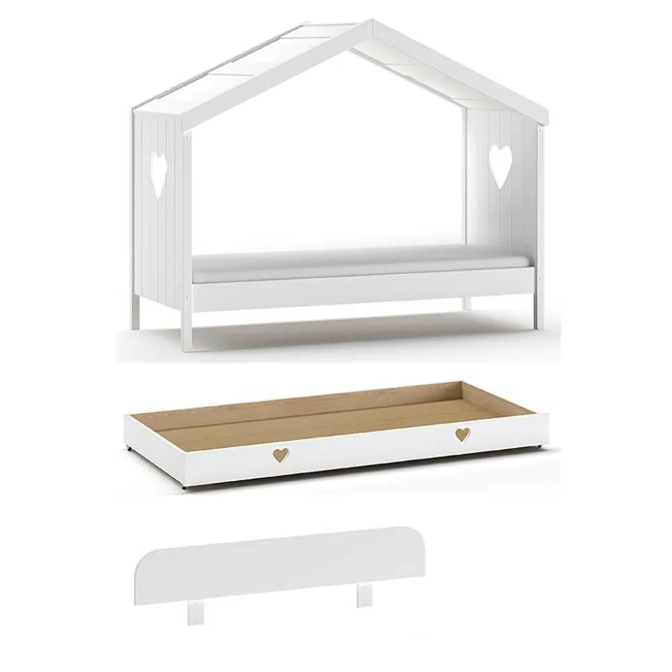 In der Variante 002 wird das Hausbett inklusive Bett-Schubkasten geliefert. Dieser verfügt über Rollen und herzförmige Grifflöcher in der Front und bietet zusätzlichen Stauraum. Der Schubkasten kann auch als Gästebett genutzt werden und hat eine maximale Belastbarkeit von 50 kg. Eine Matratze im Format 90×190 cm mit einer Höhe bis zu 12 cm passt perfekt.