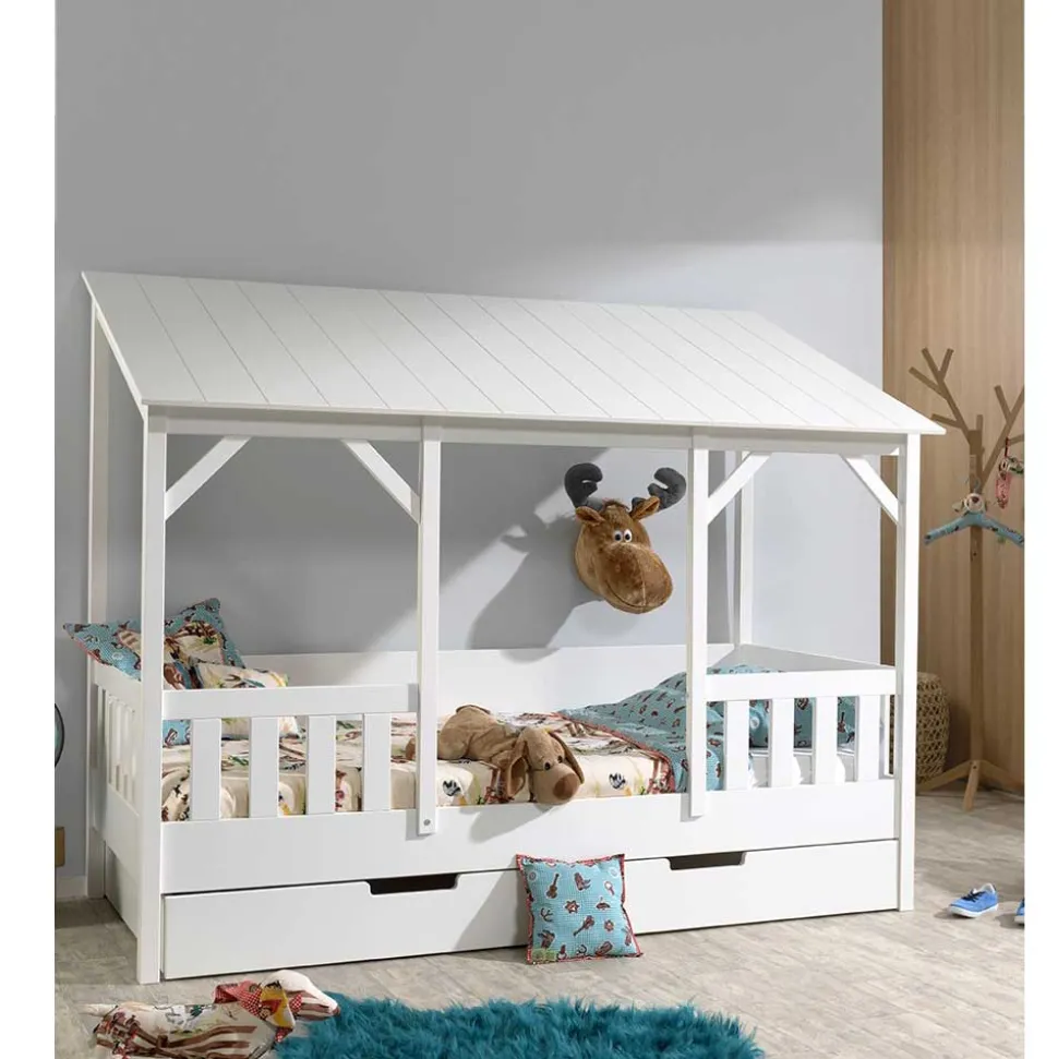 Mit seinem kreativen Haus-Design lässt das Bett „Zanoas“ der Fantasie freien Lauf. Ob als gemütliche Schlafstätte oder als Spielhöhle, die vielseitige Gestaltung bietet Kindern jede Menge Raum für kreative Rollenspiele und Abenteuer. Das authentische, nach vorne abfallende Dach und die dekorative Umrandung verleihen dem Bett nicht nur eine einzigartige Optik, sondern schaffen auch eine behagliche Atmosphäre, in der sich Ihr Kind rundum wohlfühlen wird.