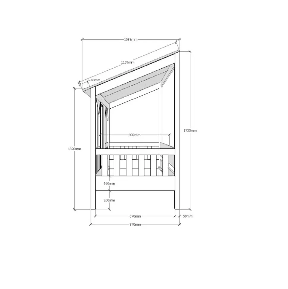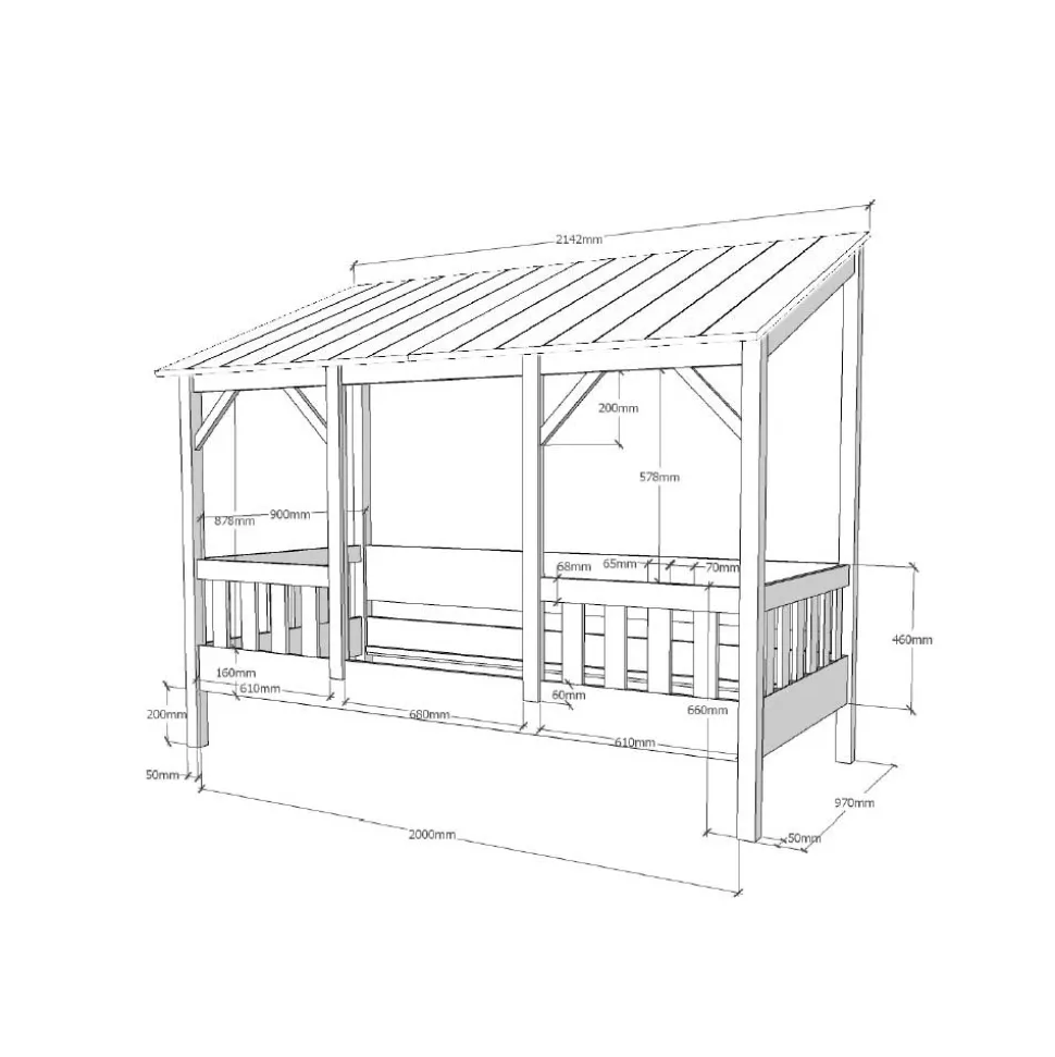 Mit den Außenmaßen von 106 cm Breite, 174 cm Höhe und 215 cm Tiefe fügt sich das Hausbett „Zanoas“ perfekt in jedes Kinderzimmer ein. Es ist groß genug, um als vollwertiges Bett zu dienen, nimmt aber nicht mehr Platz ein, als nötig. Der breite Eingang von etwa 68 cm und die dekorative Umrandung von 66 cm Höhe bieten zudem genügend Raum für einen komfortablen Ein- und Ausstieg.