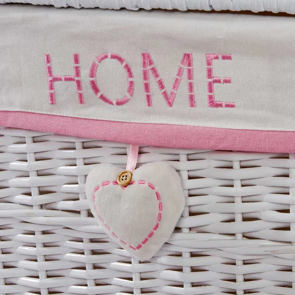 Jeder Korb ist zusätzlich mit liebevollen Akzenten versehen: Eine „Home“-Stickerei auf dem Stoffinlett sowie ein dekoratives Stoffherz mit Knopf, das vorn am Korb hängt, unterstreichen den charmanten Look.