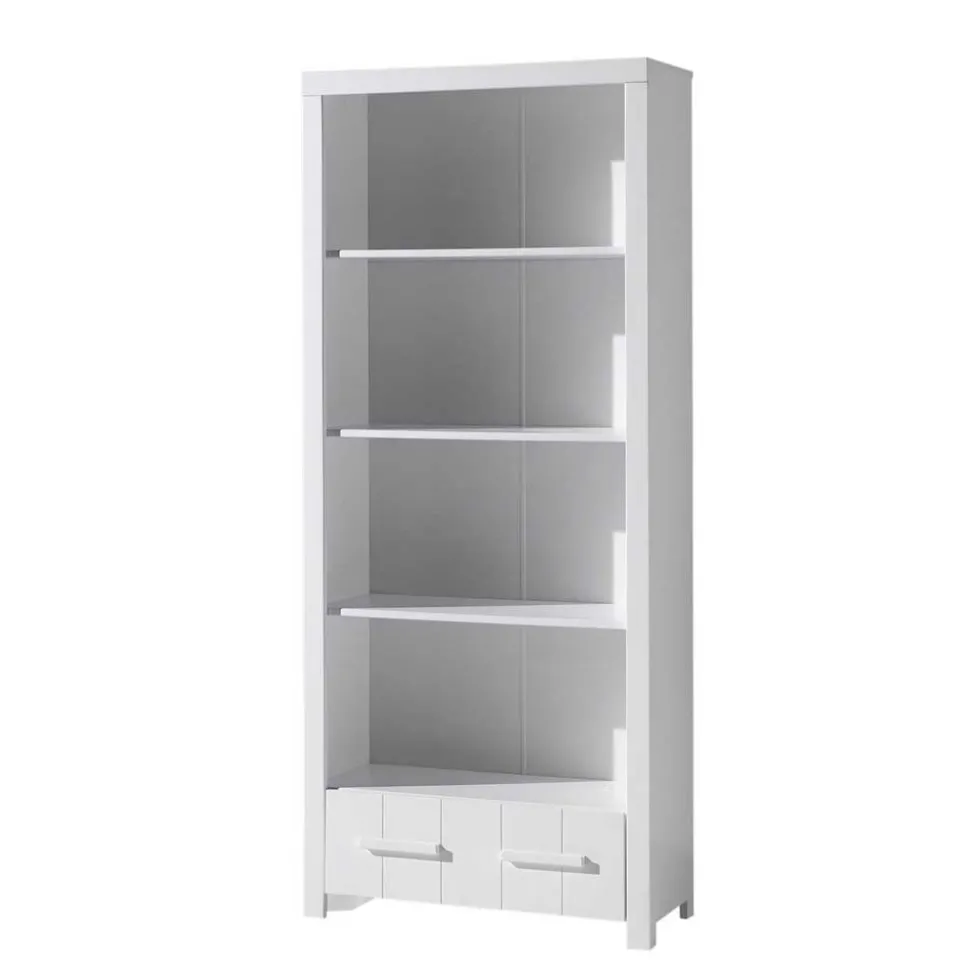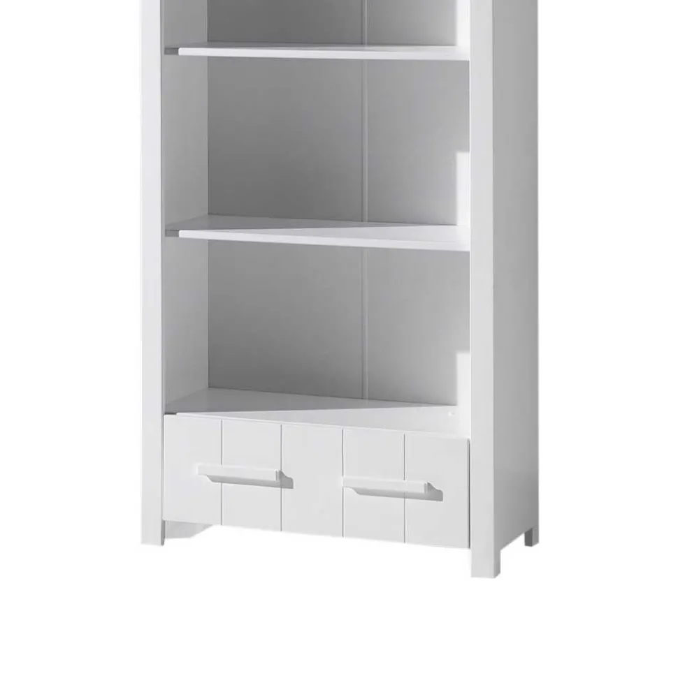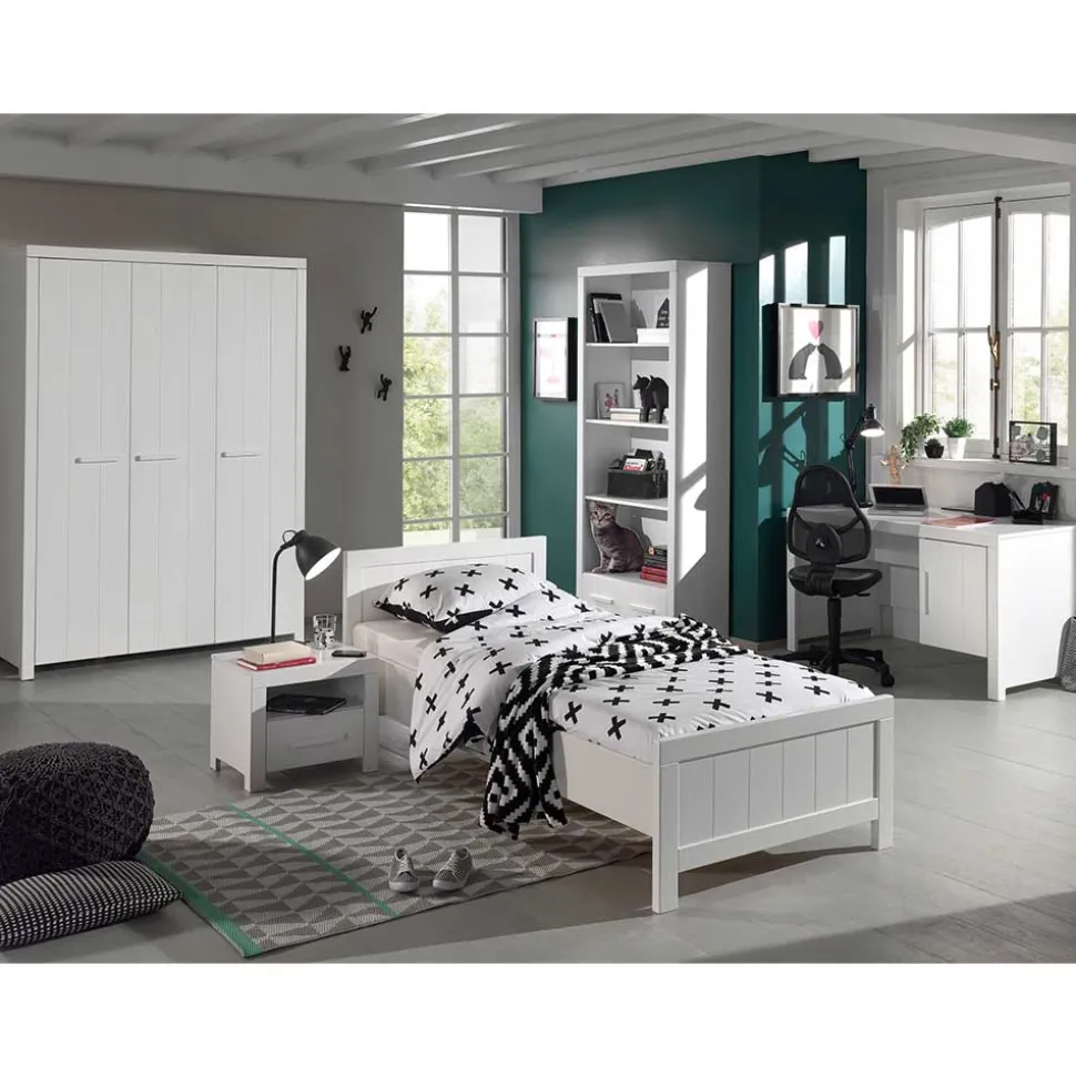 Gestalten Sie das Reich Ihres Kindes mit der bezaubernden Kinderzimmer Kompletteinrichtung „Ellen“. Diese hochwertige Möbelkombination im charmanten Modern Country Style erstrahlt in einem freundlichen und hellen Weiß, das sich mühelos mit anderen Farben und Stilen kombinieren lässt. Jedes Stück in dieser fünfteiligen Einrichtung, bestehend aus einem Bett, einer Nachtkommode, einem Kleiderschrank, einem Schreibtisch und einem Regal, wurde mit Liebe und Sorgfalt aus solidem MDF und massivem Kiefernholz gefertigt. So wird das Kinderzimmer zu einem behaglichen und funktionalen Ort zum Spielen, Lernen und Träumen.