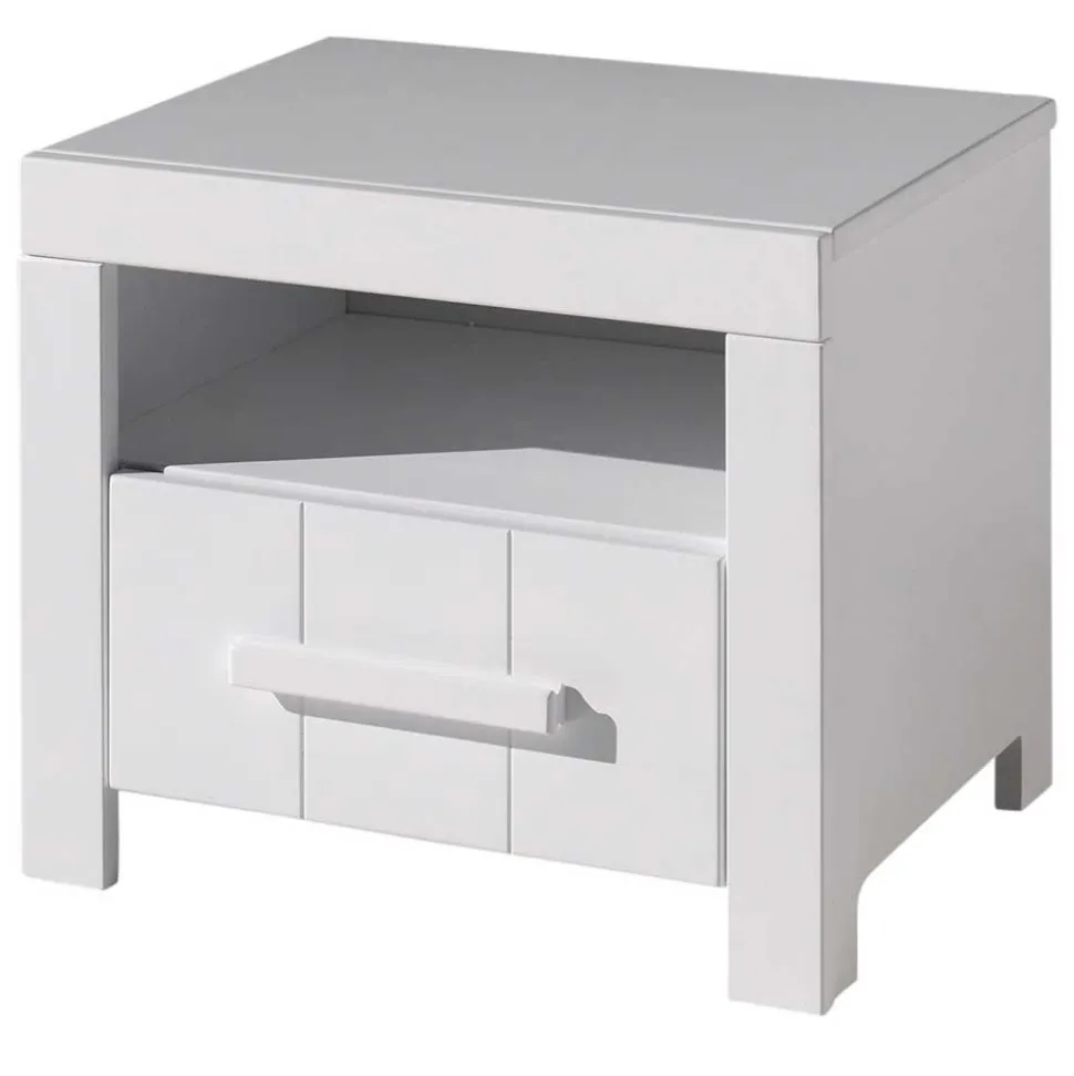 Die Möbel der Kompletteinrichtung „Ellen“ überzeugen durch ihre robusten Materialien. Das Bett, das aus massivem Kiefernholz und MDF gefertigt ist, zeichnet sich durch strapazierfähige, lackierte Oberflächen aus, die sowohl pflegeleicht als auch widerstandsfähig sind. Die Nachtkommode und der Kleiderschrank bieten nicht nur ausreichend Stauraum, sondern auch eine harmonische Ergänzung zum Gesamtbild. Die Oberflächen sind geschmackvoll gestaltet, und die aufgesetzten Griffleisten aus Holz in Weiß setzen ansprechende Akzente.