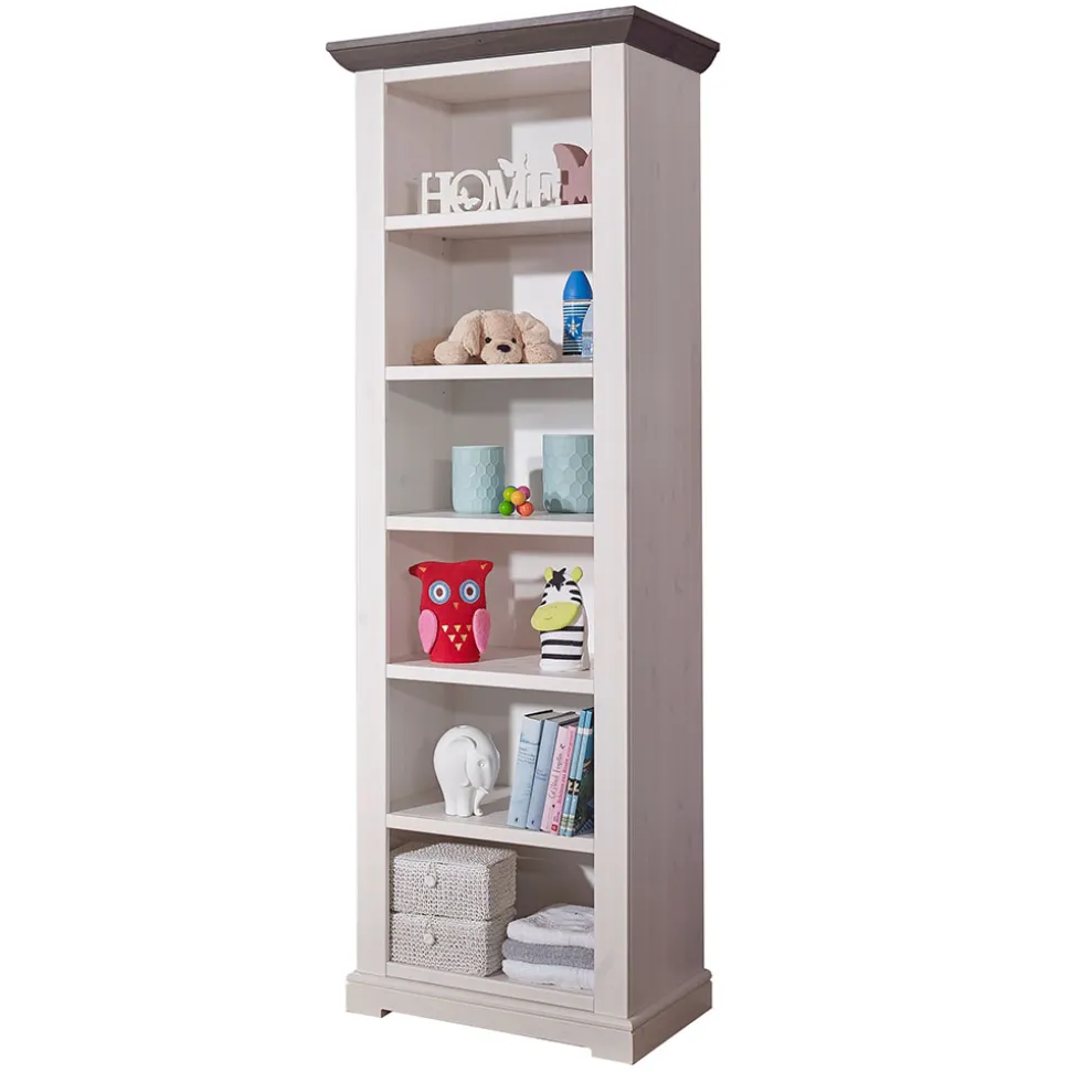 Das Standregal „Rimesca“ besticht durch seine hochwertige Verarbeitung und sein ansprechendes Design. Es wurde aus massivem Kiefernholz gefertigt und verfügt über eine Kombination aus weiß gewachsten und mit einem Grey-Wash-Effekt lackierten Holzoberflächen. Dies verleiht dem Regal einen charmanten Vintage-Look und macht es zu einem Blickfang in jedem Raum.