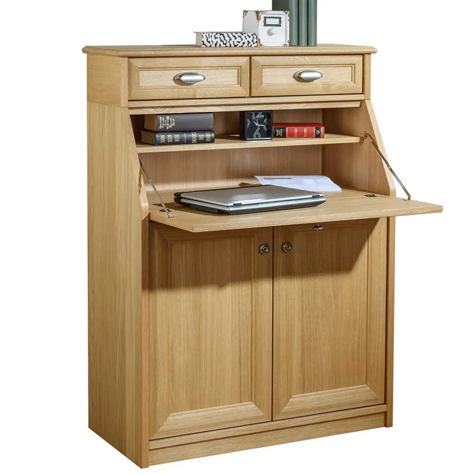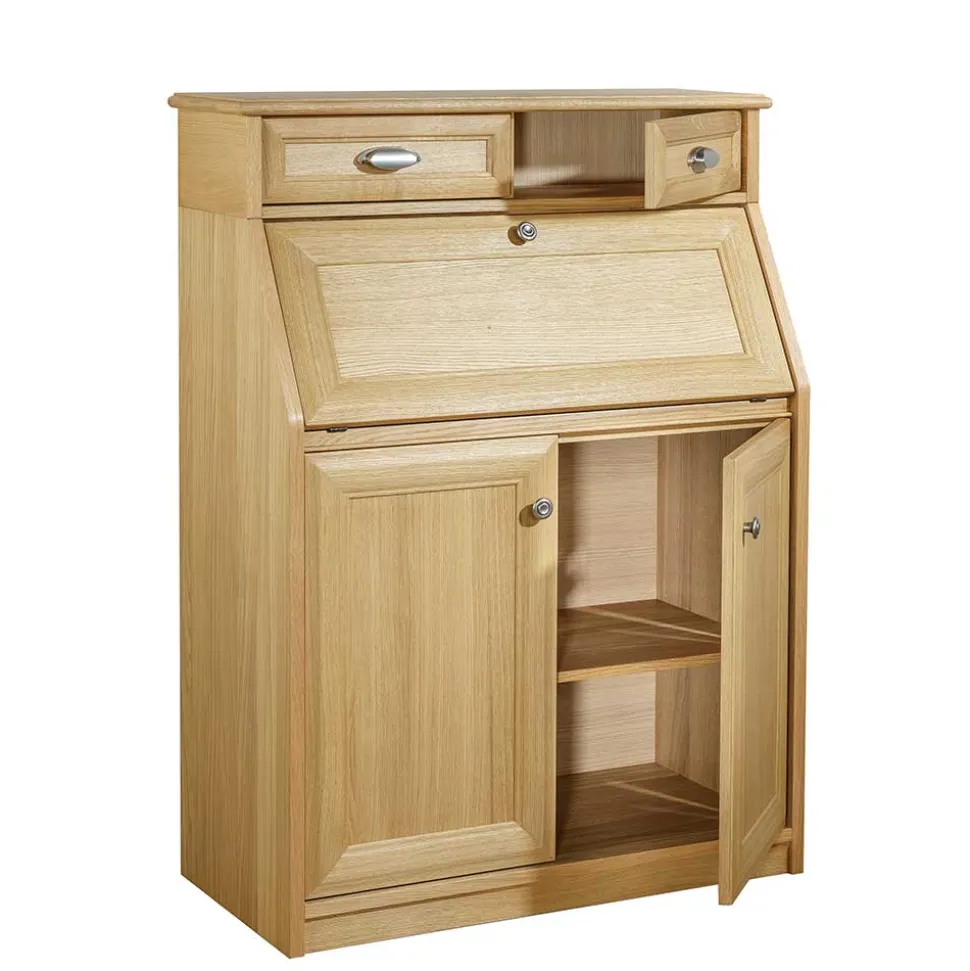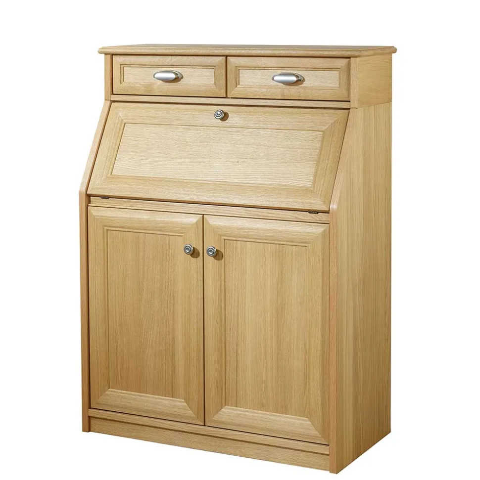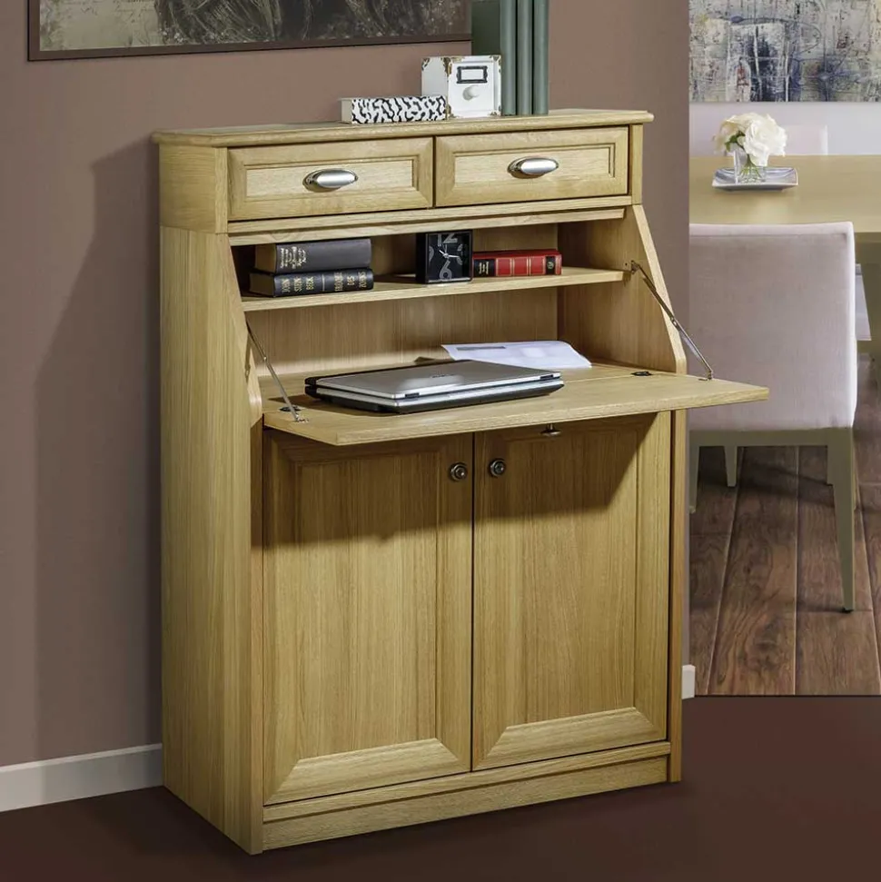 Das klassisch zeitlose Design des „Optica“ strahlt Harmonie und Eleganz aus und fügt sich nahtlos in jede Raumgestaltung ein. Die Fronten des Sekretärs sind mit hochwertigen Rahmenaufdopplungen aus massivem Eichenholz verziert, die die Qualität des Möbelstücks unterstreichen. Besondere Akzente setzen die dekorativ quer verlaufende Holzmaserung sowie die handlichen Muschel- und Knopfgriffe aus Metall, die nicht nur schön aussehen, sondern auch eine hohe Funktionalität bieten.