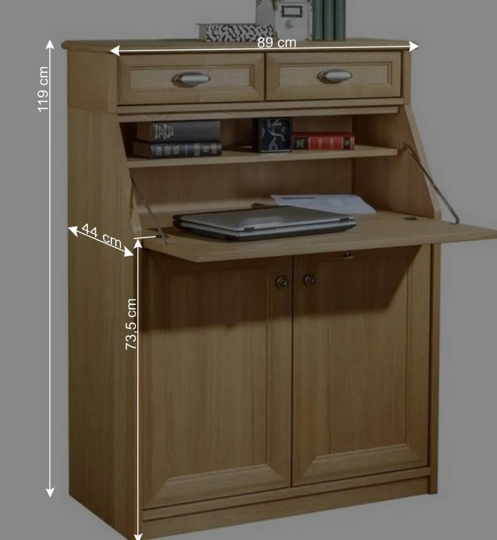 Trotz seiner kompakten Abmessungen von 89 cm Breite, 119 cm Höhe und 44 cm Tiefe bietet „Optica“ überraschend viel Stauraum. Der intelligente Aufbau mit zwei kleinen Türen oben und einer großen Doppeltür unten verbirgt einen verstellbaren Einlegeboden, der es Ihnen ermöglicht, den Raum optimal zu nutzen. Die Schreibklappe, ausgestattet mit stabilen Metallbeschlägen, offenbart eine geräumige Inneneinteilung für all Ihre Bürobedürfnisse, während die Höhe der Schreibplatte bei angenehmen 73,5 cm liegt.