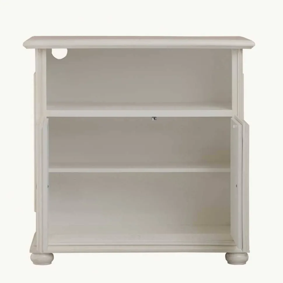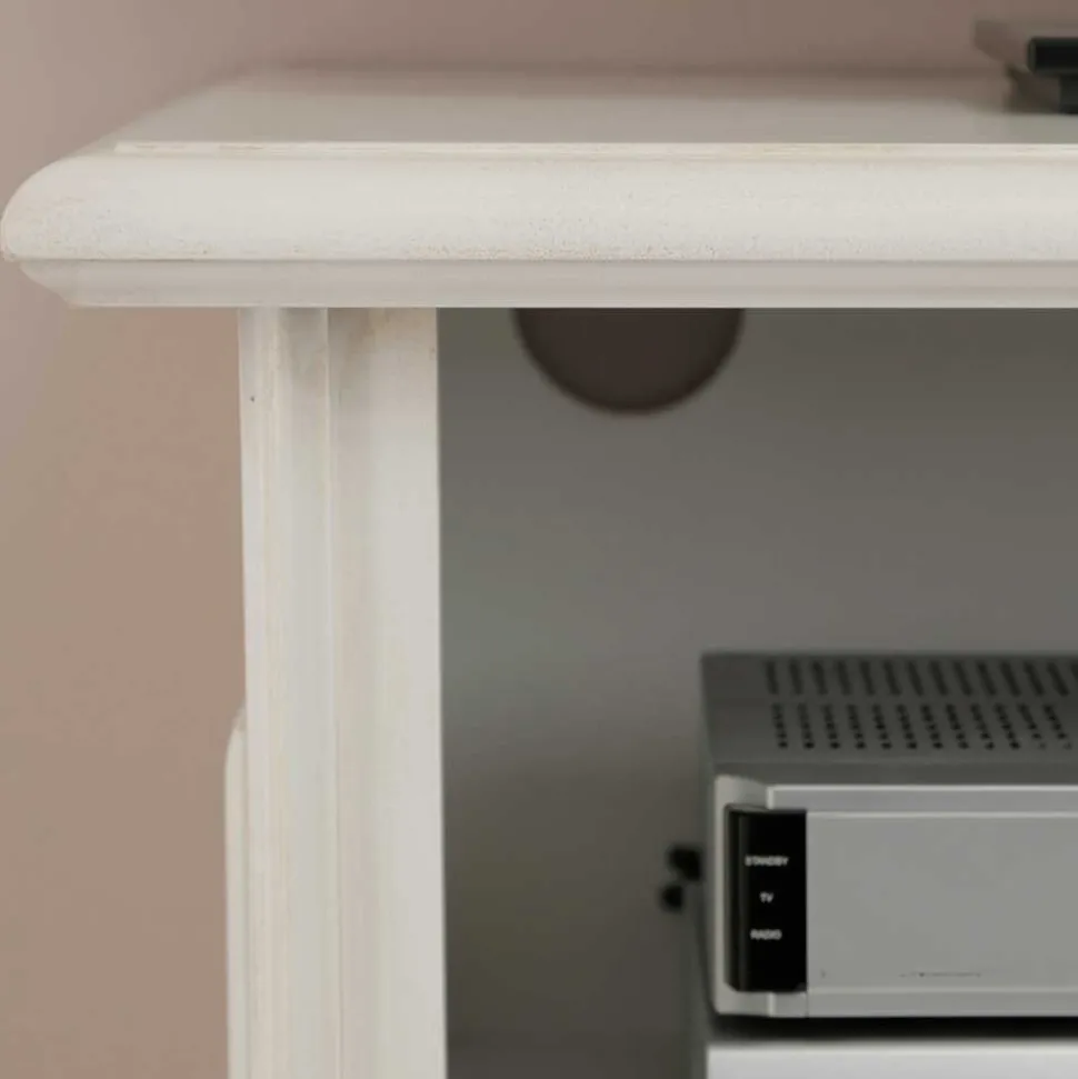 Die Kommode bietet ein großes, offenes Gerätefach, ideal für Ihre Unterhaltungselektronik. Ein praktisches Loch zur Kabelführung in der Rückwand sorgt dafür, dass alle Kabel ordentlich und diskret verlegt werden können. Hinter den beiden Türen, die mit hochwertigen Metallbeschlägen ausgestattet sind, befindet sich zusätzlicher Stauraum. Die Türen sind aufwändig in Kassettenoptik gestaltet und mit hübschen Zierfräsungen versehen, die dem Möbelstück eine raffinierte und edle Note verleihen.