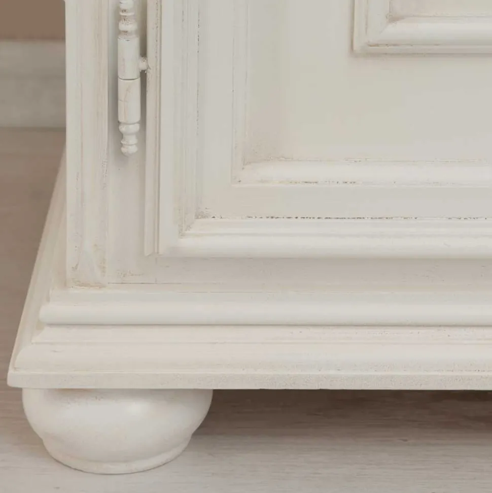 Die Holzoberflächen sind mit Tanganjika Holz echtholzfurniert und im weißen Antiklook lackiert. Echtholzfurnierung ist ein Verfahren, bei dem dünne Schichten aus echtem Holz auf die Oberflächen der Möbel aufgetragen werden. Dieses Verfahren bewahrt die natürliche Holzmaserung und verleiht jedem Möbelstück eine einzigartige Optik. Die Lackierung im weißen Antiklook fügt eine charmante, leicht gebrauchte Ästhetik hinzu. Durch die handwerkliche Lackierung entstehen kleine Farbeinschlüsse, leichte Unebenheiten und Haarrisse, die jedem Stück eine unverwechselbare Persönlichkeit verleihen.