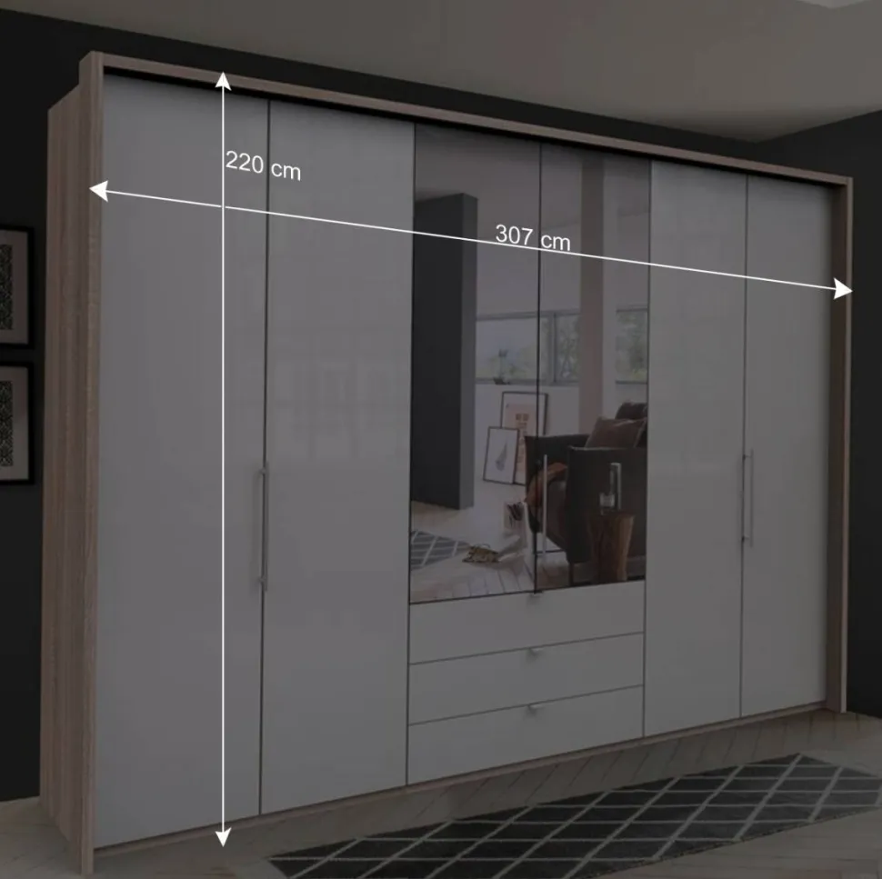 Mit Außenmaßen von 300 cm Breite, 58 cm Tiefe und 216 cm Höhe bietet der „Bosays II“ Kleiderschrank jede Menge Stauraum für Ihre Kleidung und Accessoires. Für noch mehr Raumgefühl und Eleganz können Sie optional den Passepartout-Rahmen hinzubuchen, der den Schrank auf großzügige 307 cm Breite und 220 cm Höhe erweitert.