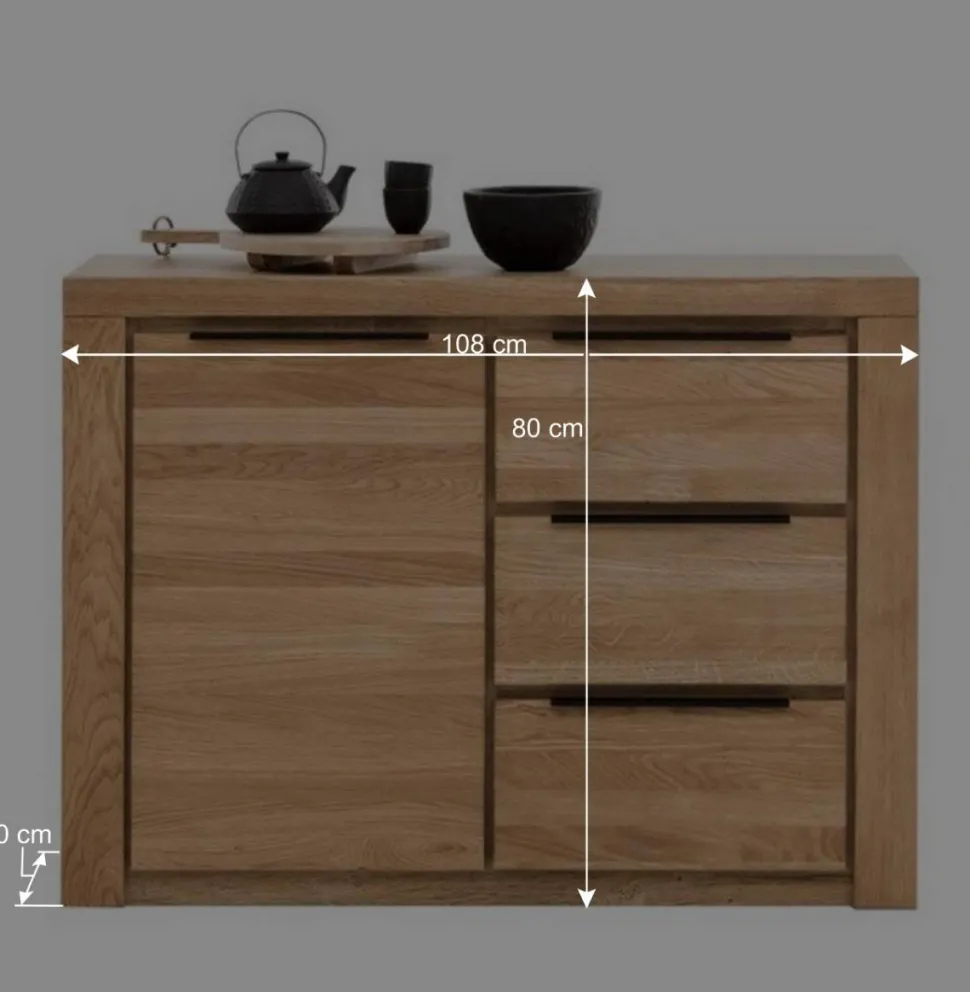 Mit einer Breite von 108 cm, einer Höhe von 80 cm und einer Tiefe von 40 cm bietet die Kombi-Kommode „Nelenia“ übersichtlichen Stauraum für all Ihre Bedürfnisse. Die linke Seite verfügt über eine elegante Drehtür aus Eichenholz, hinter welcher sich ein praktischer Einlegeboden befindet. Das Highlight sind jedoch die drei rechts angebrachten Schubladen, die dank des Kugelauszugs aus Metall mühelos und leise gleiten.