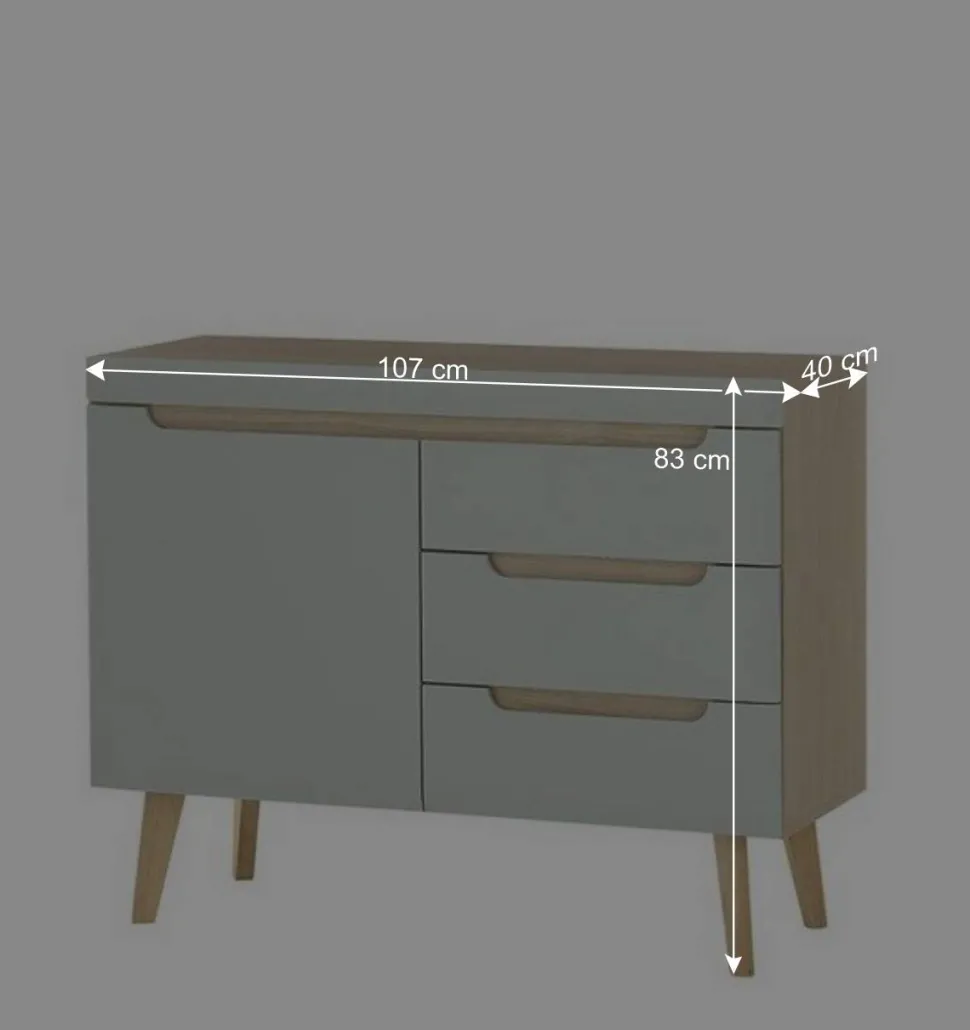 Die Kombi-Kommode „Armina“ misst 107 cm in der Breite, 83 cm in der Höhe und 40 cm in der Tiefe und bietet somit großzügigen Stauraum, ohne viel Platz einzunehmen. Drei Schubladen auf der rechten Seite mit robusten Metallauszügen ermöglichen ein sanftes und leises Öffnen und Schließen. Auf der linken Seite finden Sie eine Tür mit eleganten Metallbeschlägen, hinter der sich ein praktischer Einlegeboden verbirgt, ideal zur Aufbewahrung verschiedenster Gegenstände. Die integrierten Griffmulden in Eichefarben unterstreichen nicht nur das Design, sondern machen die Handhabung besonders komfortabel.
