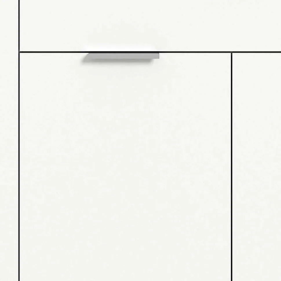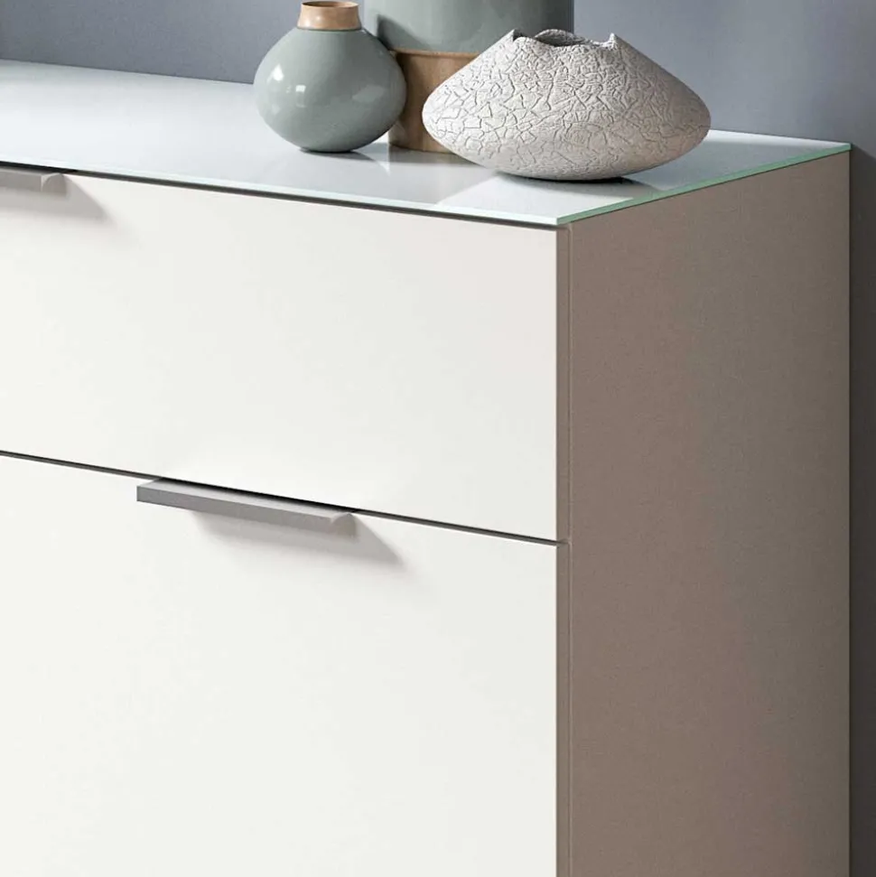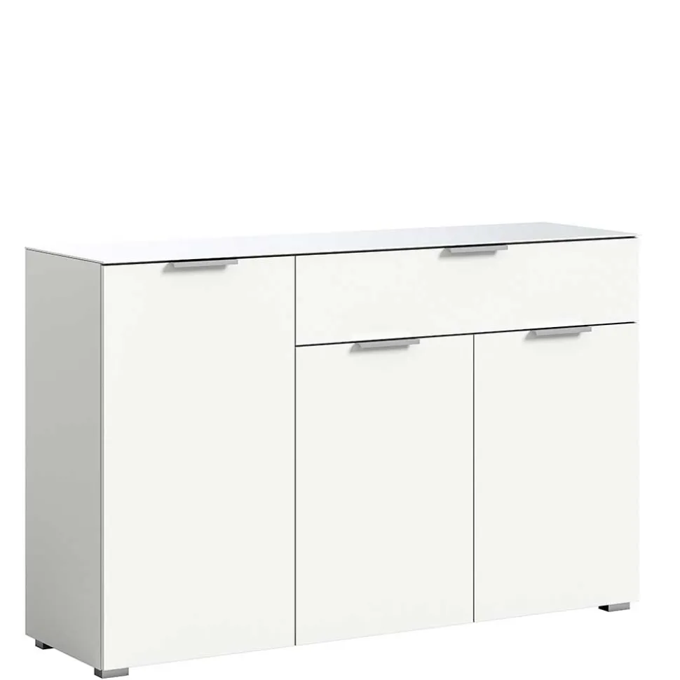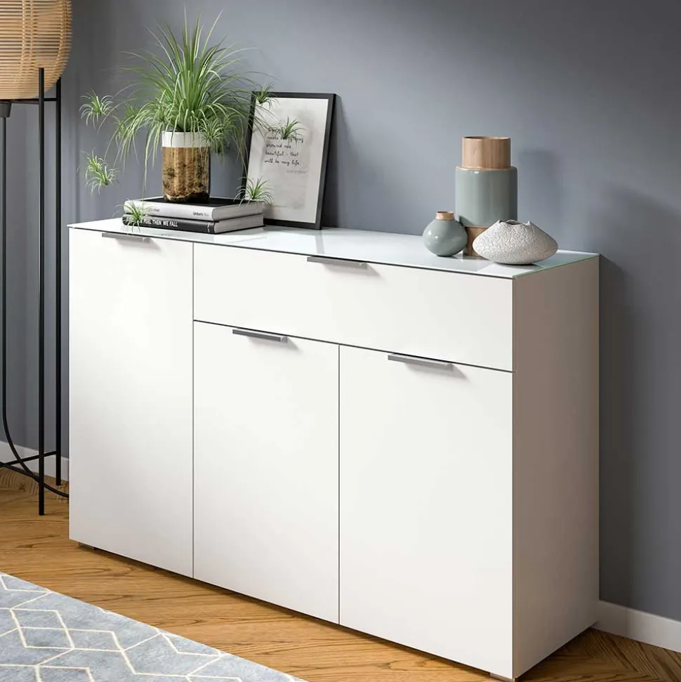 Gefertigt aus robuster Spanplatte und veredelt mit einer 3 mm starken, unterseitig weiß siebbedruckten Glasauflage, überzeugt die Kommode mit einer hochwertigen Optik und praktischen, pflegeleichten Oberflächen. Die dezenten Aluminium-Kantengriffe und silberfarbenen Kunststoffgleiter (2 cm hoch) ergänzen das klare Design funktional und ästhetisch zugleich.