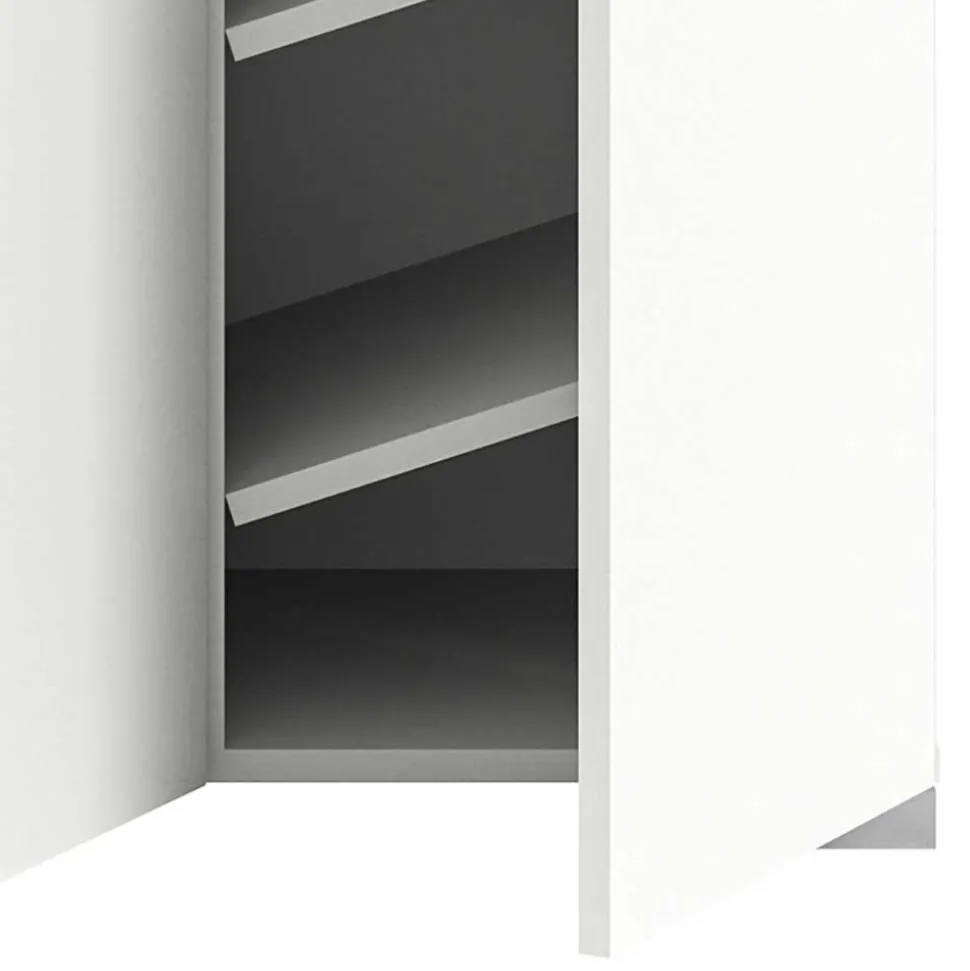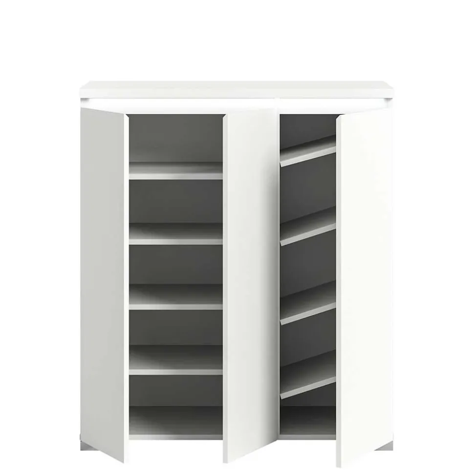 Hinter drei elegant verarbeiteten Türen mit stabilen Metallbeschlägen verbirgt sich ein wahres Stauwunder. Die Doppeltür öffnet sich zu vier Einlegeböden, ideal für die Aufbewahrung Ihrer Schuhe. Neben der Einzeltür finden Sie vier schräge Böden, die einen schnellen Zugriff und eine optimale Übersicht gewährleisten. Die grifflosen Öffnungen unterstreichen das minimalistische Design und bieten einen komfortablen, nahtlosen Mechanismus zum Öffnen der Türen.