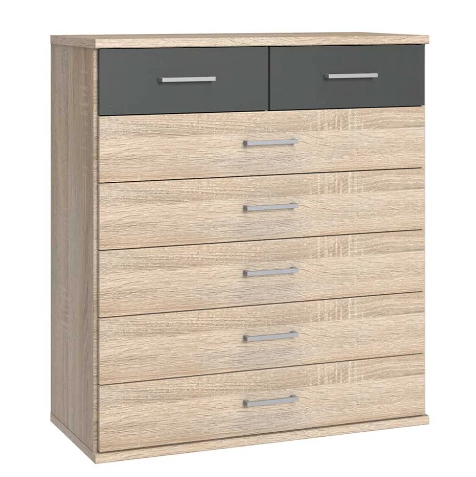 Mit ihrer stilvollen Kombination aus Eiche Sägerau und Dunkelgrau fügt sich die Hochkommode „Danah“ nahtlos in jedes Wohnambiente ein. Die neutrale Farbwahl ermöglicht eine problemlose Kombination mit anderen Möbelstücken und Accessoires. Die folierten Oberflächen bieten nicht nur eine ansprechende Holzoptik, sondern sind auch äußerst pflegeleicht und widerstandsfähig gegen Kratzer und Feuchtigkeit.