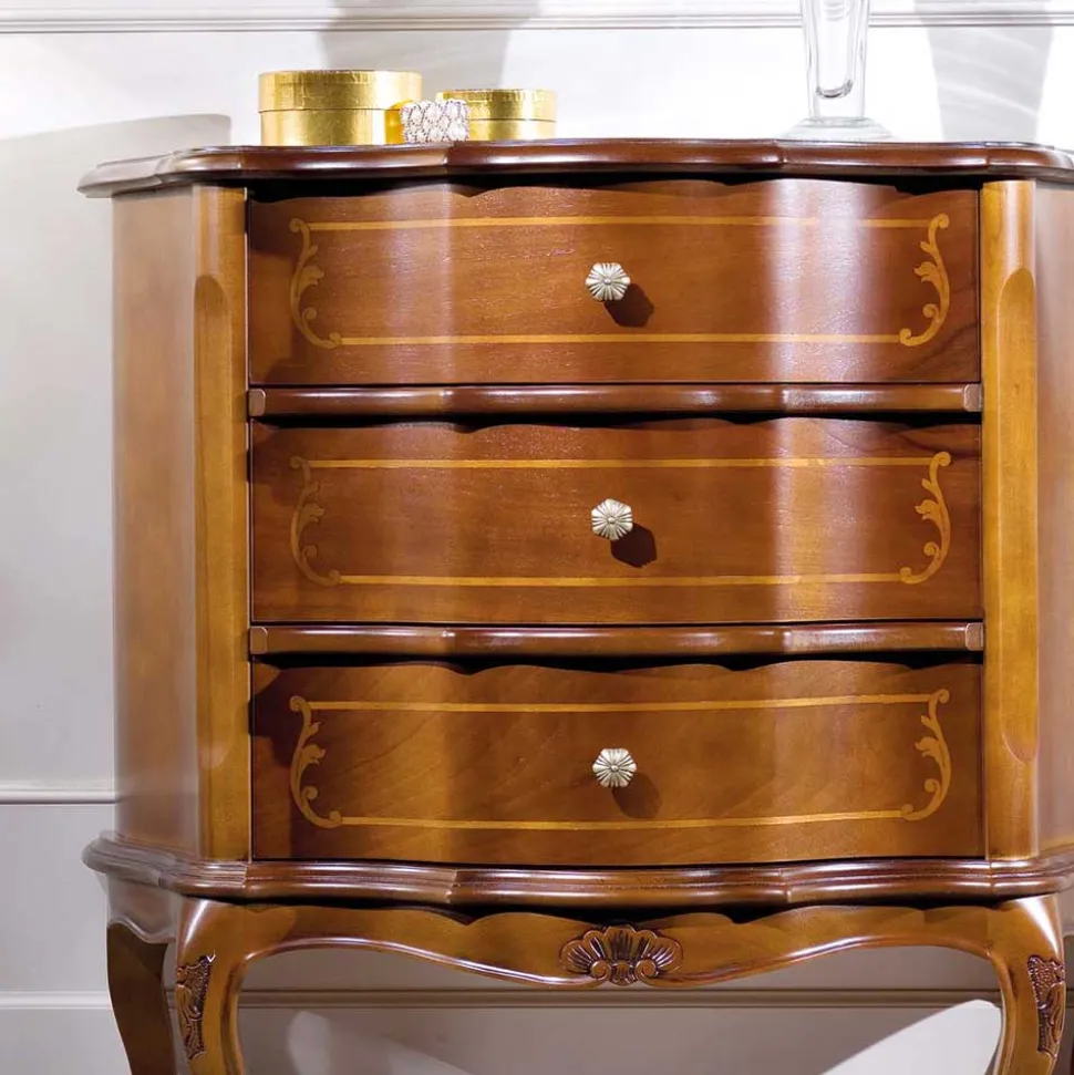 - Drei Schubladen aus Pappelmassivholz mit Holzauszug sorgen für ausreichend Stauraum, handgearbeitete Intarsien als extra Verschönerung