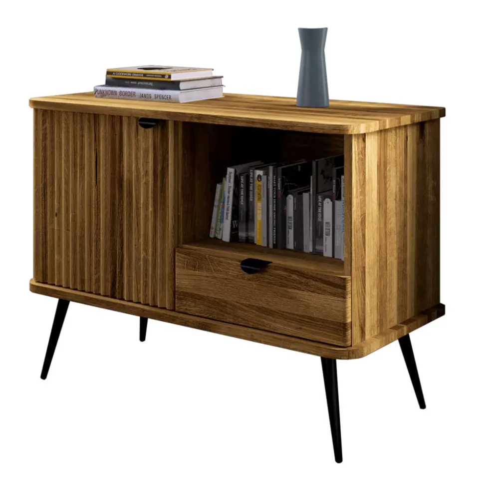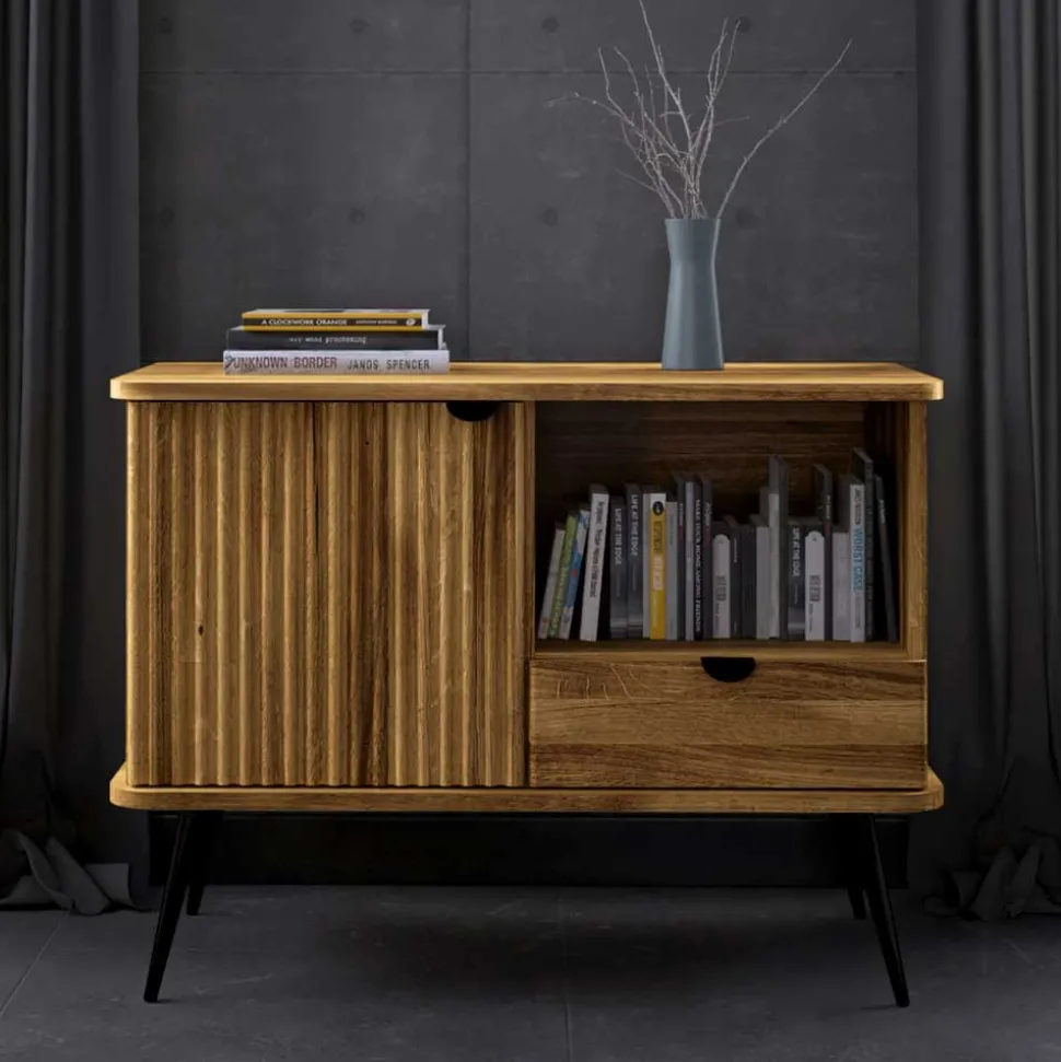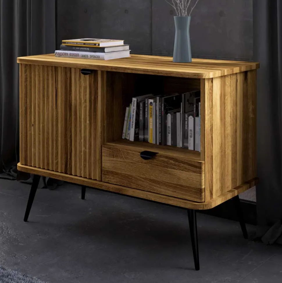 Die Kommode „Casarius“ ist ein Meisterwerk modernen Designs. Hergestellt aus massiver Wildeiche und Stahl, verkörpert jedes Möbelstück die natürliche Schönheit der Holzmaserung in ihrer authentischsten Form. Dank dieser einzigartigen Eigenschaft ist jede Kommode ein wahres Unikat, das Ihrem Wohnraum einen Hauch von Individualität verleiht.