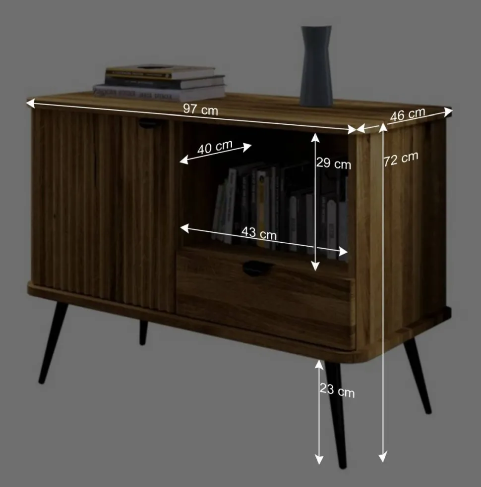 Eine Tür mit Soft-Close-Funktion und Metallbeschlägen ermöglicht Ihnen einen bequemen Zugang zum Innenraum der Kommode. Die Türfronten sind mit einer aufwändig plastischen Rillenstruktur gestaltet, die ein zusätzliches ästhetisches Element bietet. Im Innenraum befindet sich ein praktischer Einlegeboden, der Ihnen die Möglichkeit gibt, den verfügbaren Platz individuell anzupassen.