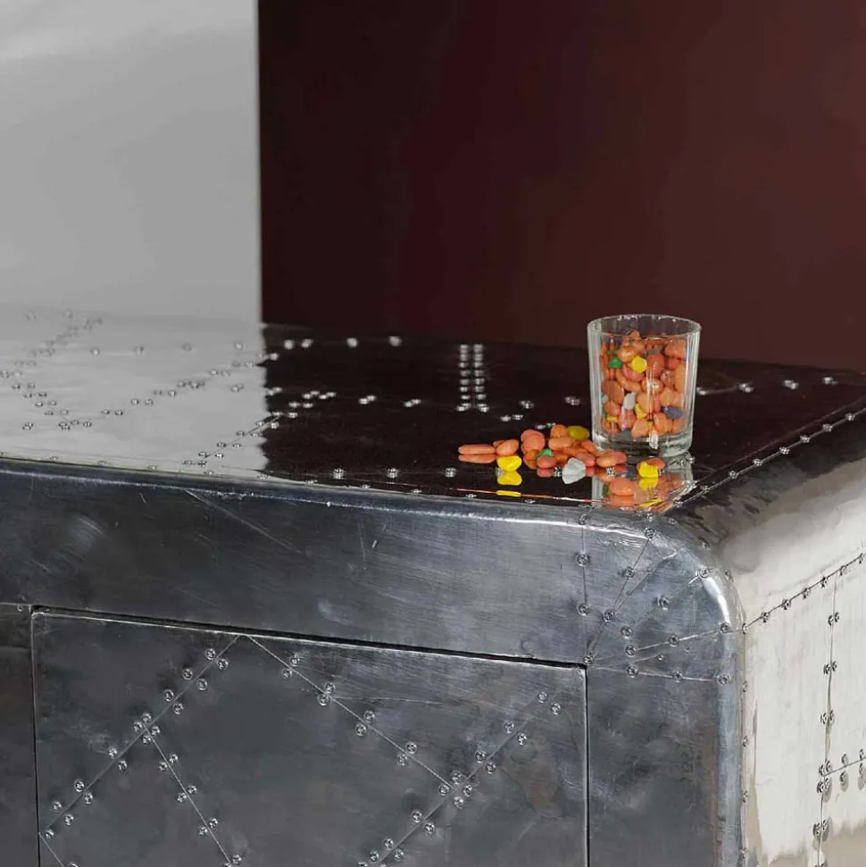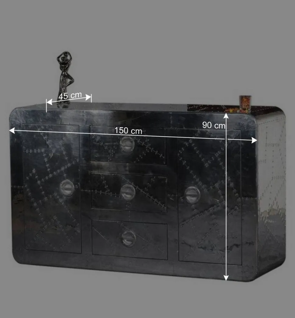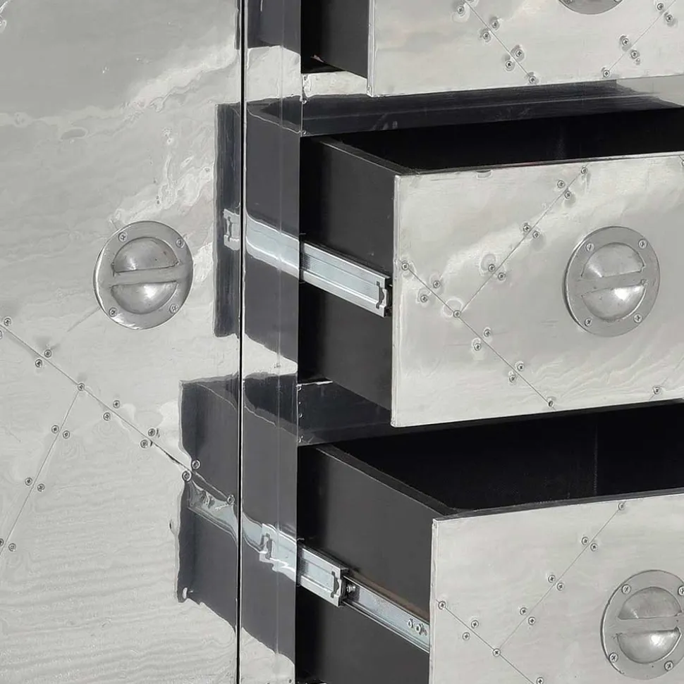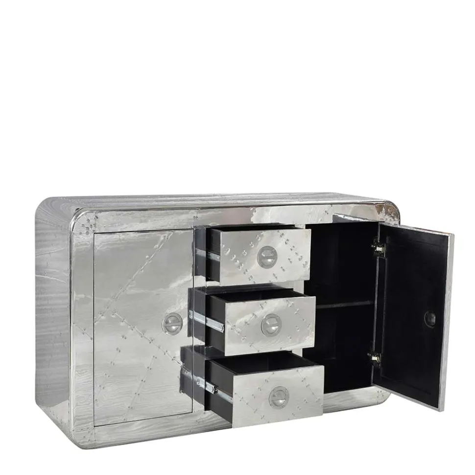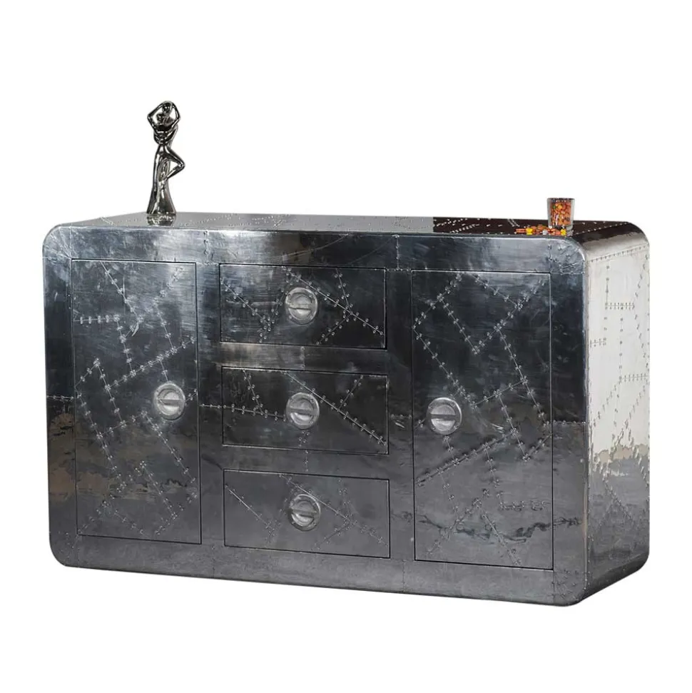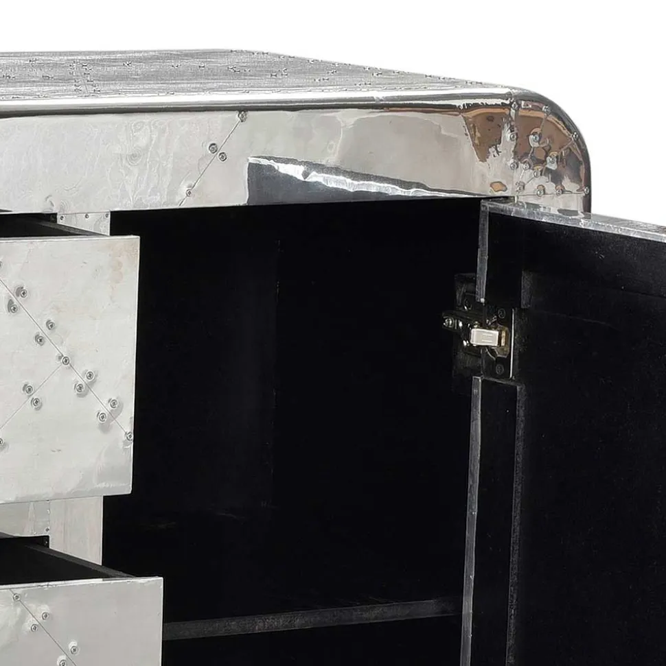 Die Oberfläche, komplett mit Aluminium beschlagen und mit Zierschrauben versehen, greift Stilelemente des Flugzeugbaus auf und macht das Sideboard zu einem echten Eyecatcher. Die Metallumrandungen und die abgerundeten Korpuskanten fügen sich nahtlos in das innovative Design ein, das an die Ästhetik klassischer Flugzeuge erinnert.
