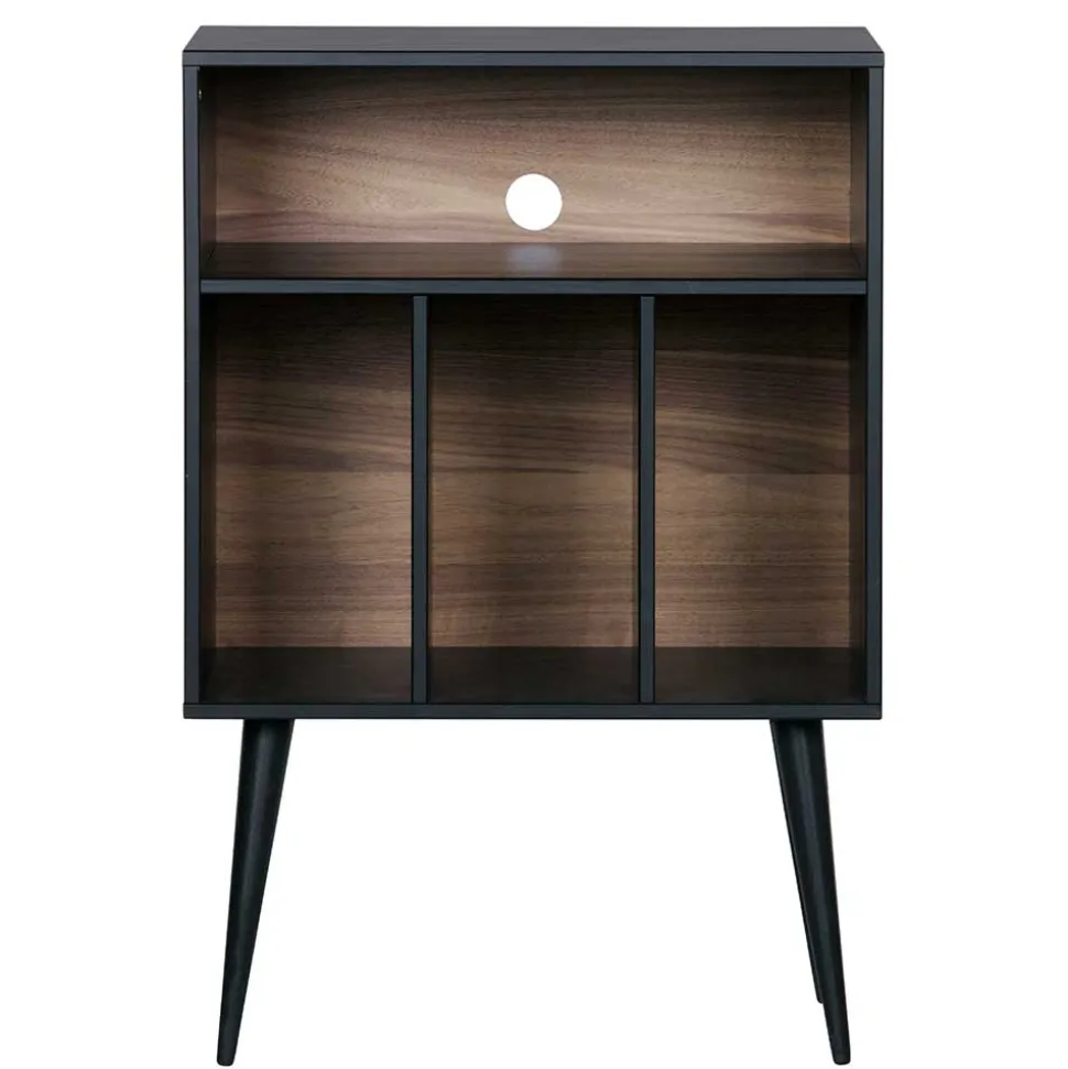 Mit Maßen von 60 cm Breite, 83 cm Höhe und 44 cm Tiefe bietet das Regal überraschend viel Stauraum. Die vier geräumigen Fächer sind ideal, um LPs und andere Gegenstände stilvoll und griffbereit zu verstauen. Besonders praktisch: das obere Fach verfügt über eine Kabelführung, perfekt für Audiogeräte.