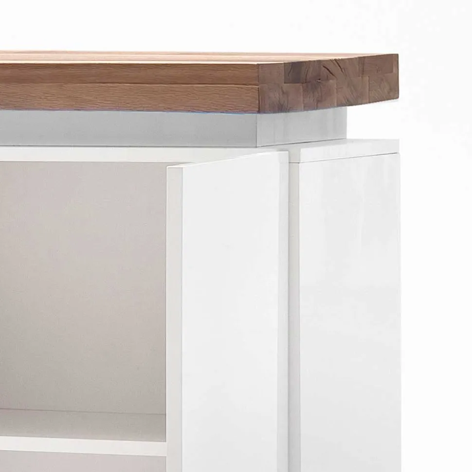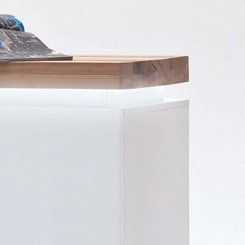 Die Kommode ist aus MDF gefertigt, einem Material, das für seine hohe Stabilität und Beständigkeit bekannt ist. Es nimmt Feuchtigkeit weniger stark auf als Massivholz und verzieht sich daher kaum, was die Langlebigkeit Ihres Möbelstücks sicherstellt. Als besonderer Hingucker dient die 6 cm starke, massive Eichenplatte als Oberboden. Diese aus massiver Asteiche gefertigte Oberplatte schafft einen attraktiven Kontrast zur mattweiß lackierten MDF-Oberfläche.