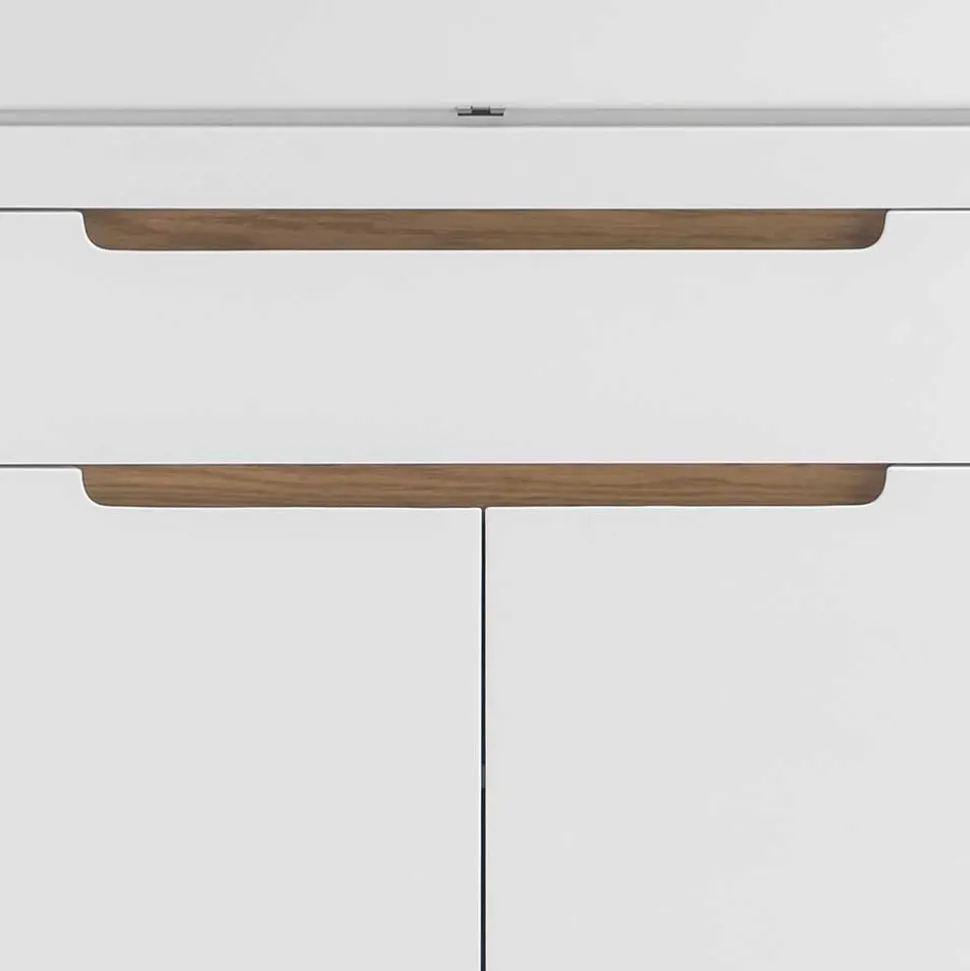 Die Oberfläche des Sekretärs ist in einem eleganten matten Weiß lackiert. Diese Lackierung verleiht dem Möbelstück nicht nur ein edles Aussehen, sondern bietet auch praktische Vorteile. Matt weiße Lackierungen sind weniger anfällig für Fingerabdrücke und Schmutz, wodurch die Reinigung erleichtert wird. Zusätzlich schützt die Lackierung das MDF vor Kratzern und anderen Beschädigungen. Die Absetzungen des Sekretärs sind mit echtem Asteichenholz furniert und natürlich geölt. Furnier ist eine dünne Schicht aus echtem Holz, die auf die Oberfläche aufgebracht wird, um das Aussehen von Massivholz zu erzielen. Diese Methode bietet die natürliche Schönheit von Holz, während sie gleichzeitig kosteneffizient und ressourcenschonend ist. Die natürliche Ölung des Holzes hebt dessen einzigartige Maserung hervor und schützt es vor Feuchtigkeit und Schmutz.