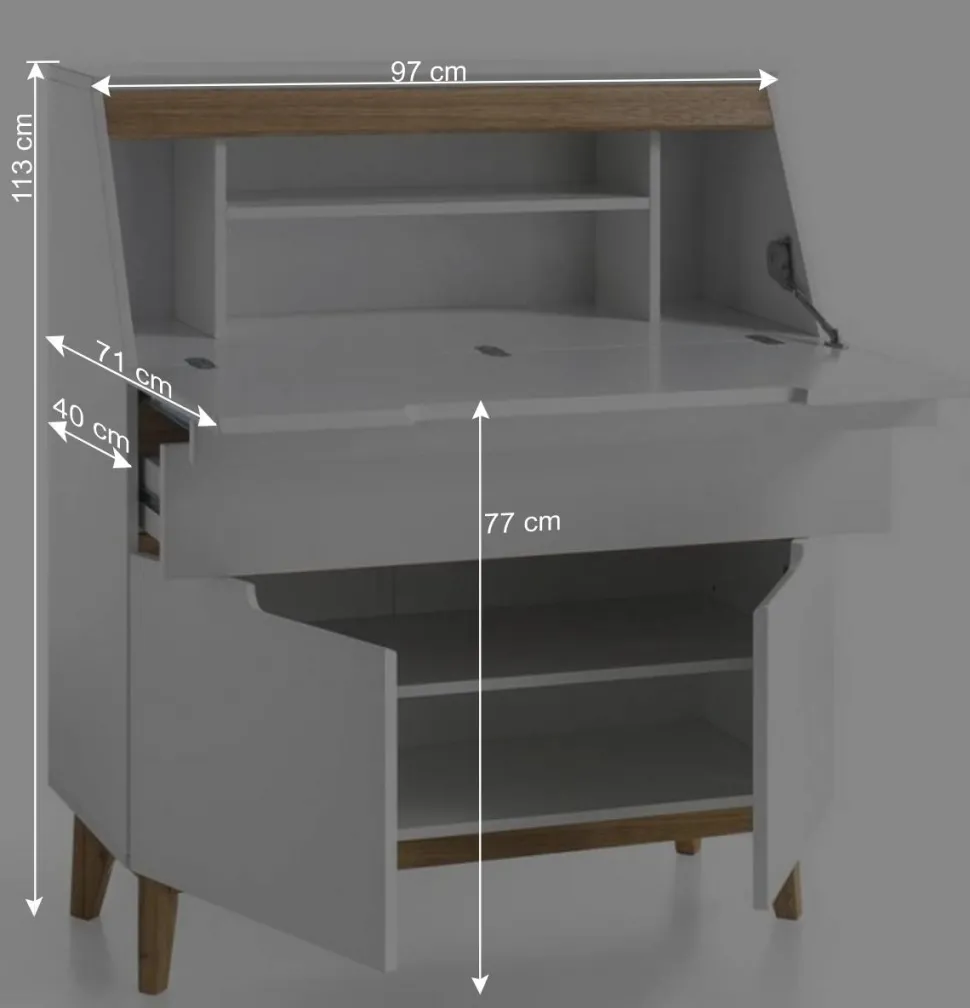 Mit einer Breite von 97 cm, einer Höhe von 113 cm und einer Tiefe von 40 cm bietet der Sekretär „Wyola“ reichlich Stauraum, ohne dabei zu viel Platz in Ihrem Raum einzunehmen. Die praktische Schreibklappe lässt sich auf eine komfortable Höhe von ca. 77 cm ausklappen, sodass eine ergonomische Arbeitsfläche entsteht. Hinter der Klappe befinden sich vier offene Fächer, die perfekt für die Aufbewahrung von Büchern, Dokumenten und Bürozubehör geeignet sind. Diese Fächer bieten eine klare Struktur und erleichtern die Organisation. Die Gesamttiefe des aufgeklappten Sekretärs beträgt ca. 71 cm, was eine großzügige Arbeitsfläche ermöglicht. Das Fach hinter der Klappe hat eine Gesamthöhe von ca. 34 cm, wobei die unteren Fächer etwa 15 cm und die oberen Fächer etwa 10 cm hoch sind. Diese Anordnung bietet ausreichend Platz für verschiedene Utensilien und erleichtert den Zugriff auf häufig benötigte Gegenstände.
