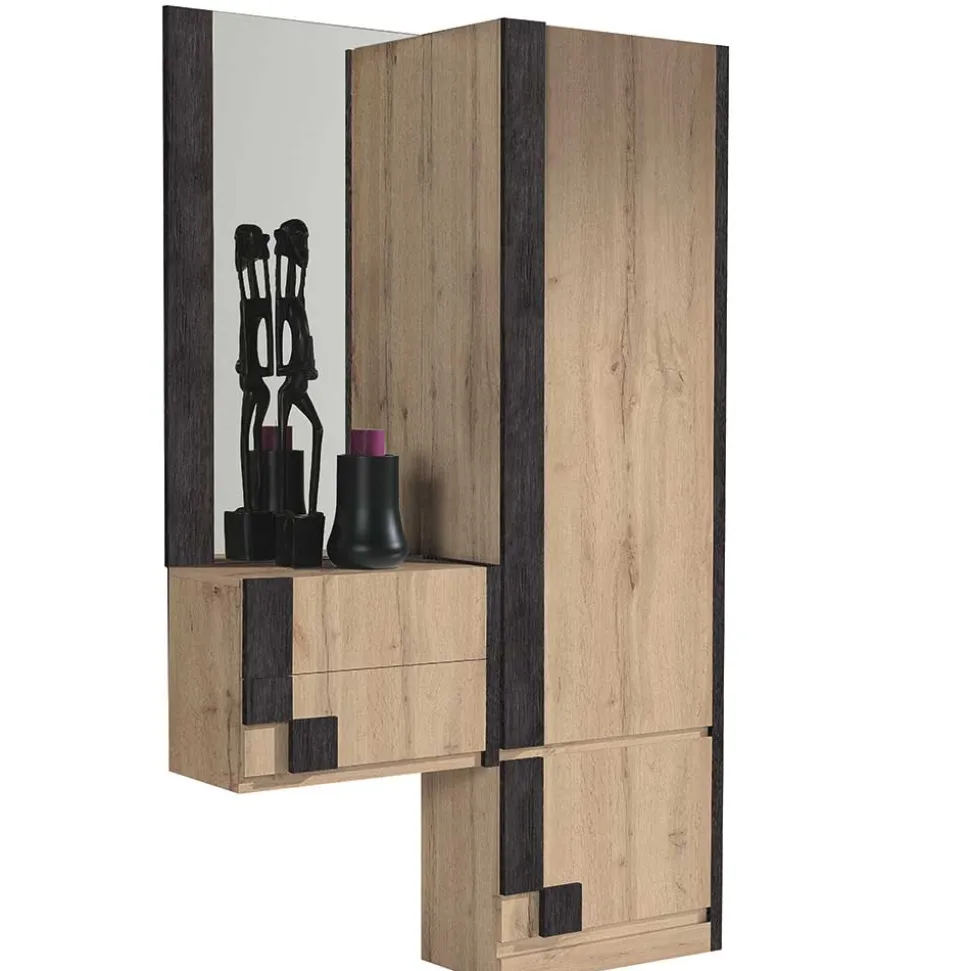 - Melaminbeschichtete Oberfläche in wildeichefarbiger und schwarzgrauer Holzoptik