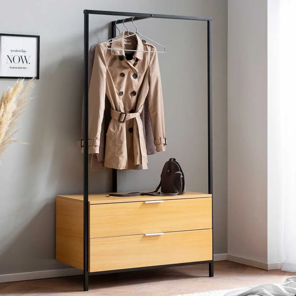 Die Kompaktgarderobe besteht aus einer robusten Spanplatte, deren Oberflächen in einer natürlichen Eichenoptik melaminbeschichtet sind. Diese Beschichtung sorgt dafür, dass das Möbel pflegeleicht und widerstandsfähig gegenüber Abnutzungen ist. Das stabile Rahmengestell aus schwarz pulverbeschichtetem Metall bietet nicht nur eine moderne Optik, sondern auch eine hohe Stabilität. Die integrierte Kleiderstange ist ideal, um Jacken, Mäntel und andere Kleidungsstücke ordentlich aufzuhängen. Die silberfarbenen Griffleisten aus Aluminium an den Schubladen runden das stimmige Gesamtbild ab.