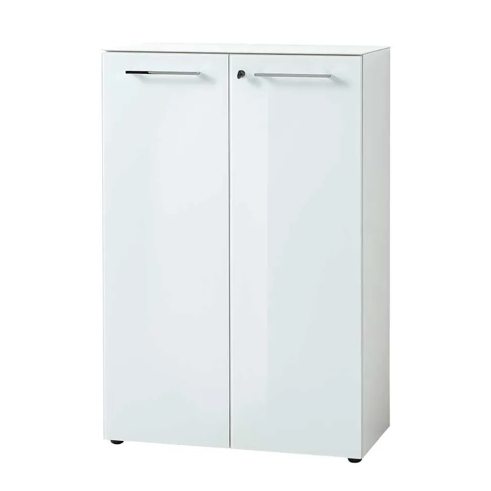Die abschließbaren Türen mit gedämpften Metallscharnieren, alle Fächer in Ordnerhöhe und die Schubkästen mit gedämpftem Metallauszug und Selbsteinzug unterstreichen die durchdachte Konstruktion und Benutzerfreundlichkeit von „Fidania“. Die dezente Eleganz der länglichen Bügel-Metallgriffe in Chromfarben rundet das Design ab und macht die Möbel zu einem stilvollen Highlight in jedem Büro.