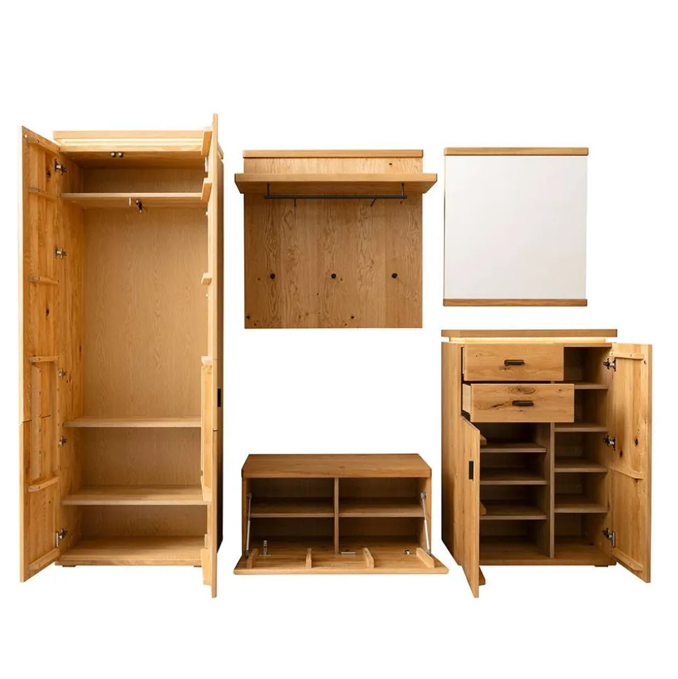 Mit der fünfteiligen Flureinrichtung „Robats“ holen Sie sich eine perfekt abgestimmte Kombination aus hochwertigem Design und durchdachter Funktionalität in Ihr Zuhause. Dieses umfassende Set besteht aus Garderobenschrank, Wandgarderobe, Garderobenbank, Flurspiegel und Hochkommode und fügt sich mühelos in moderne und rustikale Einrichtungsstile ein. Die Materialien und Verarbeitung begeistern durch Balkeneiche Massivholz, Wildeiche Furnier und edle, geölte Oberflächen, die die natürliche Schönheit und Qualität der Möbel unterstreichen.