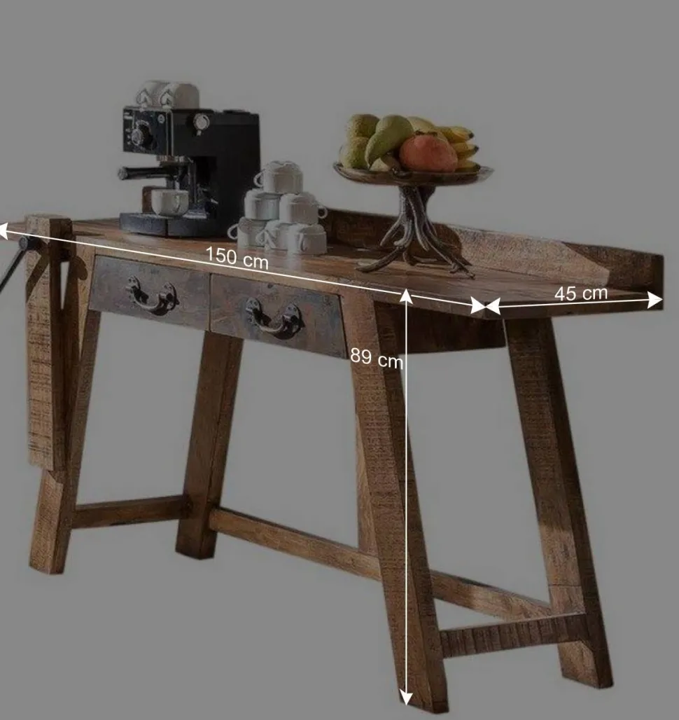 Mit einer Breite von 150 cm, einer Höhe von 89 cm und einer Tiefe von 45 cm bietet der Konsolentisch „Bahiro“ nicht nur eine großzügige Tischplatte, sondern auch praktischen Stauraum. Zwei Schubkästen mit nostalgischen Klappgriffen aus Metall und robusten Holzauszügen bieten Platz für all Ihre kleinen, wichtigen Dinge. Die Ähnlichkeit des Tisches zu einer alten Werkbank verleiht ihm einen originellen, charakterstarken Look, der in jedem Raum ein Hingucker ist. Das markante Vierfußgestell ist durch stabile Verstrebungen verbunden, was nicht nur für eine außergewöhnliche Optik sorgt, sondern auch die Stabilität und Langlebigkeit des Möbelstücks garantiert.