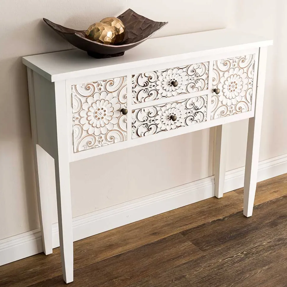 - Detailverliebte Konsole in Antikweiß und Goldfarben
