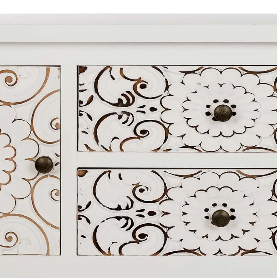 Jedes Stück der Serie „Acacio“ ist ein Unikat. Die Holzoberflächen sind in einem charmanten Antikweiß gewischt und lackiert, wodurch eine nostalgische, leicht verwitterte Optik entsteht. Diese bewusst integrierten Gebrauchsspuren verleihen dem Möbelstück einen authentischen Vintage-Charakter und machen es zu einem echten Hingucker.