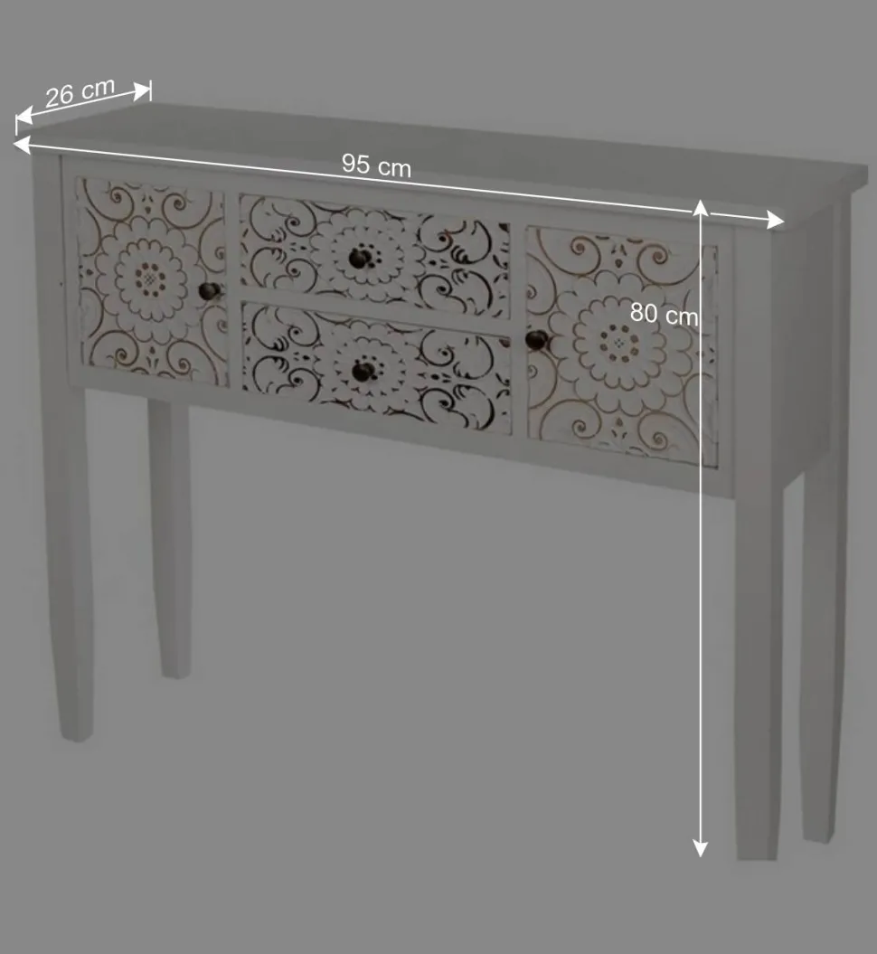 Mit einer Breite von 95 cm, einer Höhe von 80 cm und einer geringen Tiefe von nur 26 cm fügt sich der Konsolentisch selbst in schmale Räume perfekt ein. Die leicht überstehende Tischplatte bietet eine elegante Ablagefläche für Dekorationen, Schlüssel oder andere Alltagsgegenstände. Darunter bieten zwei Schubladen Platz für kleinere Utensilien wie Briefe oder Accessoires, während die beiden Türen zusätzlichen Stauraum hinter hübschen Ornamentfronten verstecken.