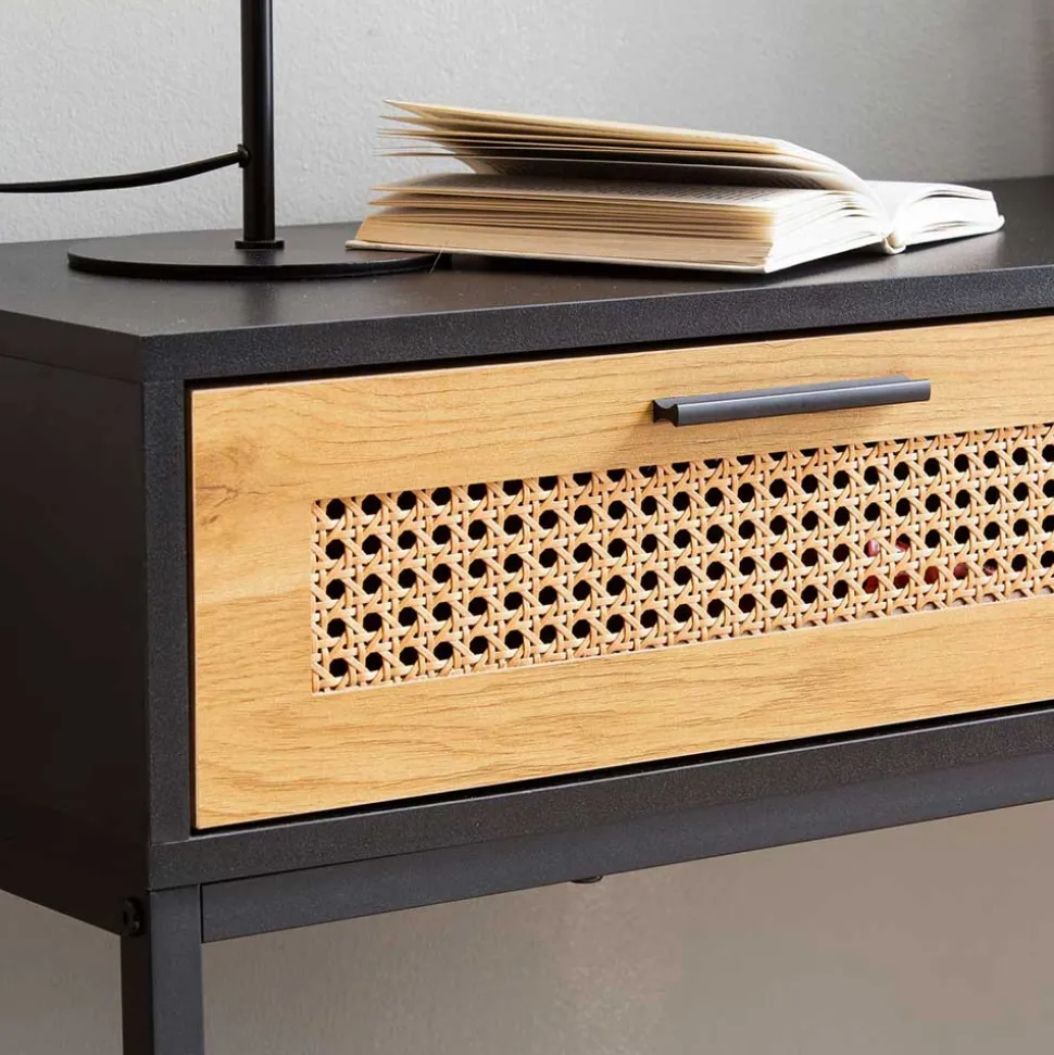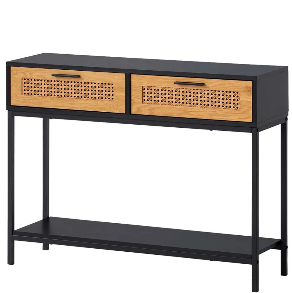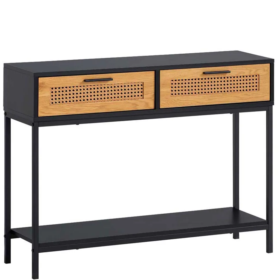 Der Konsolentisch besticht durch seine durchdachte Materialauswahl. Hergestellt aus robustem MDF, Kunstrattan und Metall, bietet er nicht nur eine ansprechende Optik, sondern auch eine hohe Stabilität. Die Oberflächen sind entweder in einer eleganten Holzoptik foliert oder in Schwarz melaminbeschichtet. Die Kombination dieser hochwertigen Materialien sorgt dafür, dass der Tisch sowohl ästhetisch als auch funktional überzeugt.