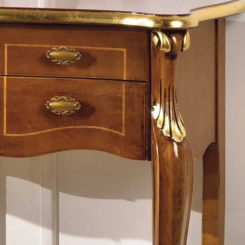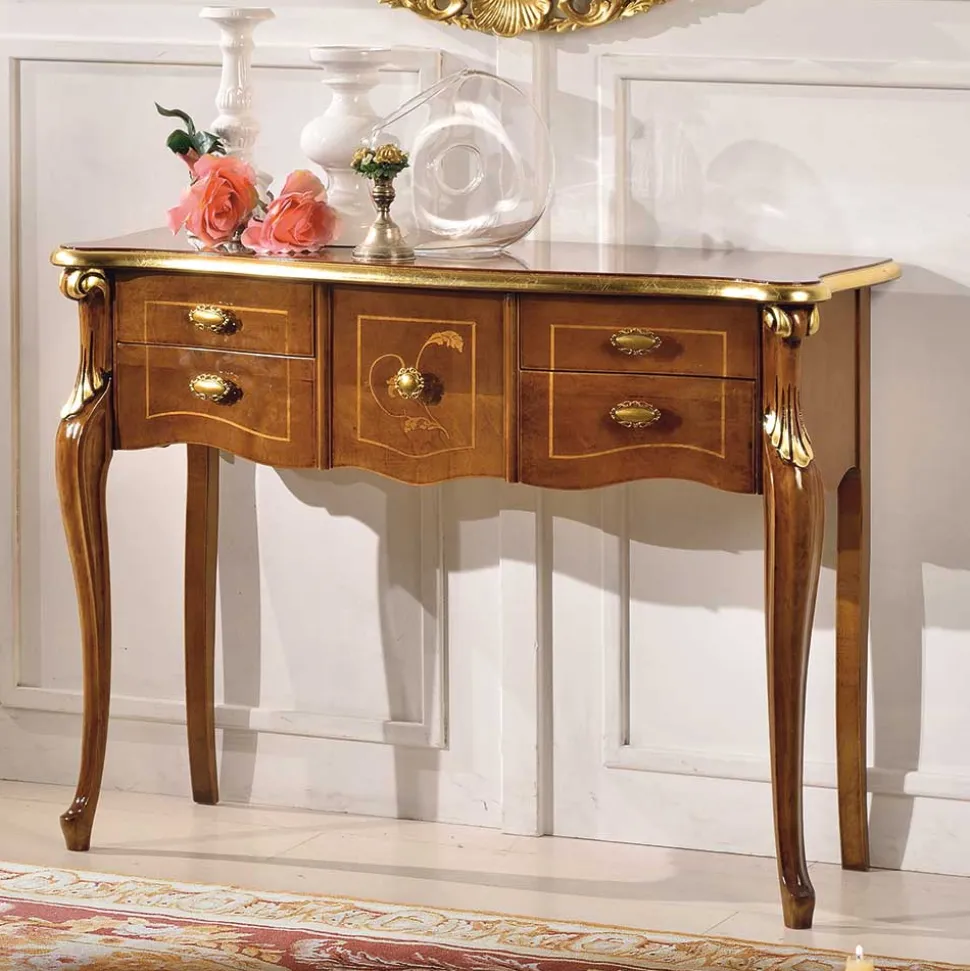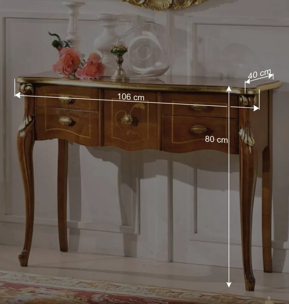 Der Konsolentisch Carlenna wird aus Massivholz und Holzwerkstoffen gefertigt. So kommt bei den Schubladen mit den herrlich schwungvoll gestalteten Fronten sowie bei den handgearbeiteten Intarsien mit floralem Charakter Pappelholz zum Einsatz. Die apart gestalteten Tischbeine mit den herrlichen Acanthus Schnitzereien bestehen hingegen aus massivem Tulpenbaum. Die Deckplatte ist aus MDF, Seitenteile sowie die Rückwand besteht aus robustem Schichtholz (mehrfach verleimte Tanne). Die harmonische Gesamtoptik des Möbelstücks ergibt sich aus einer hochwertigen Furnierung mit Nussbaum. Die Holzoberflächen sind zudem lackiert. Einzelne Dekorelemente und Kanten des Konsolentisches sind zudem in Gold hervorgehoben. Ansprechend gestaltete Knopfgriffe aus Metall runden das Erscheinungsbild des Möbels perfekt ab.