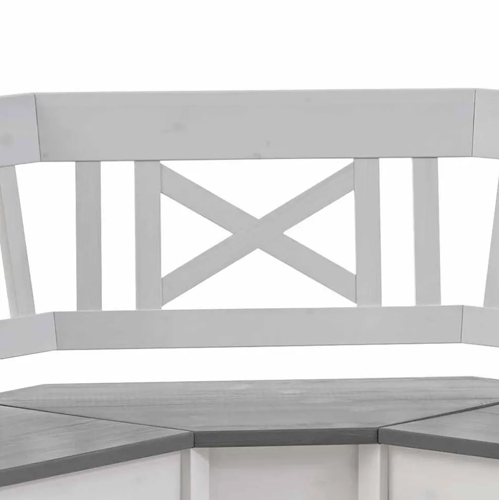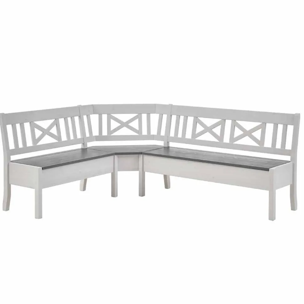 Die elegante Farbkombination aus weiß lackierten Flächen und einer grau gebeizten Sitzfläche mit durchscheinender Maserung sorgt für ein harmonisches und stilvolles Gesamtbild. Die dezente Farbgestaltung unterstreicht den Landhausstil und macht die Eckbank zu einem echten Blickfang in jedem Raum. Zudem trägt die Lackierung dazu bei, das Holz zu schützen und dessen natürliche Schönheit dauerhaft zu bewahren.