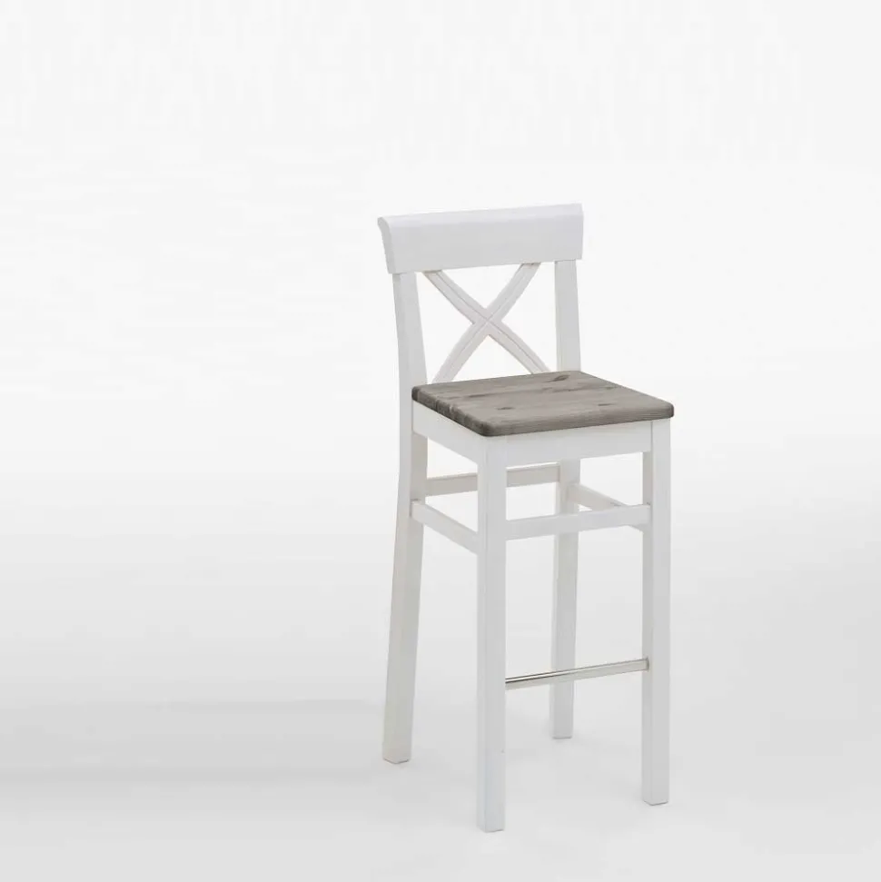 Ein besonderes Highlight ist die stilvolle Farbgestaltung des Barstuhls Yoan. Das Gestell wurde in einem eleganten Weiß lackiert, während die Sitzfläche in einem warmen Grau gebeizt wurde. Durch diese Behandlung bleibt die natürliche Maserung des Holzes sichtbar, wodurch jeder Stuhl eine individuelle Note erhält. Die Kombination aus sanfter Farbgebung und natürlicher Struktur verleiht ihm eine edle, aber dennoch rustikale Anmutung – perfekt für alle, die Wert auf stilvolles und authentisches Design legen.
