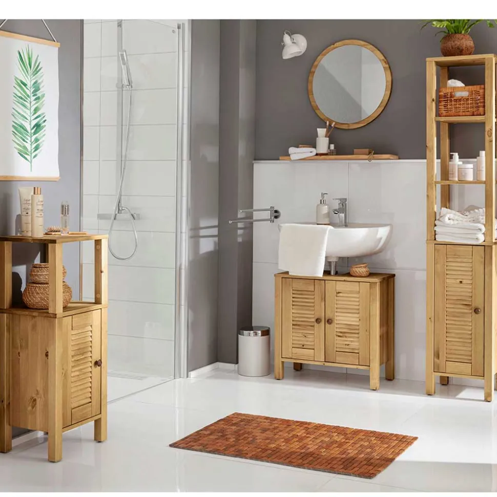 Jedes Element des Zavieca-Sets ist sorgfältig aus massivem Kiefernholz gefertigt, bekannt für seine Haltbarkeit und seinen natürlichen Charme. Kiefernholz bringt nicht nur eine warme, einladende Atmosphäre in Ihr Badezimmer, sondern ist auch wegen seiner Langlebigkeit und Festigkeit hochgeschätzt. Die gebeizten und geölten Oberflächen bewahren die natürliche Schönheit des Holzes, verbessern die Maserung und bieten zusätzlichen Schutz vor Feuchtigkeit und Abnutzung.