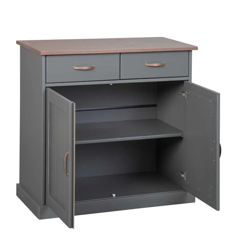 Die Oberflächen der Kommode sind in einem stilvollen Grau gehalten, während die Oberplatte sich in einem kontrastreichen Braun präsentiert. Diese Farbkombination verleiht der Kommode nicht nur einen modernen Touch, sondern auch eine Atmosphäre von Wärme und Gemütlichkeit. Die hochwertige Lackierung schützt das Holz nicht nur, sondern betont auch dessen natürliche Schönheit und sorgt für eine leichte Reinigung.