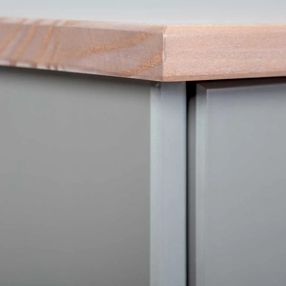Die Türen der Kommode sind mit Paneelfüllungen aus MDF veredelt, einem Material, das für seine glatte Oberfläche und Formbeständigkeit geschätzt wird. MDF ist zudem umweltfreundlich, da es aus Holzresten hergestellt wird, und bietet eine ideale Grundlage für die feine, graue Lackierung, die die Türen unserer Kommode ziert.