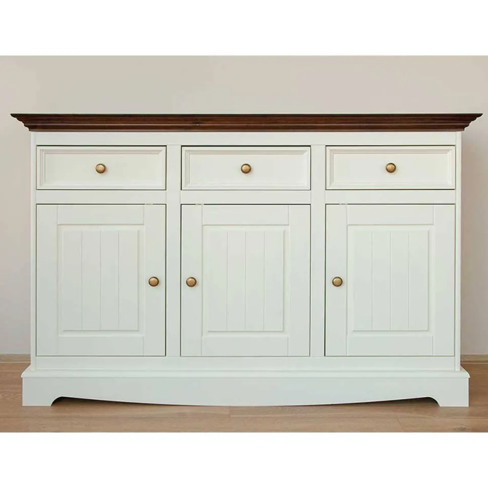 Die Oberseite in Nussbaumfarben bietet einen ansprechenden Kontrast zum weißen Korpus und unterstreicht den eleganten Landhauscharakter. Runde Knopfgriffe in Altmessingfarben fügen sich harmonisch in das Gesamtdesign ein und betonen die Liebe zum Detail, die in jedem Aspekt dieser Kommode sichtbar wird.