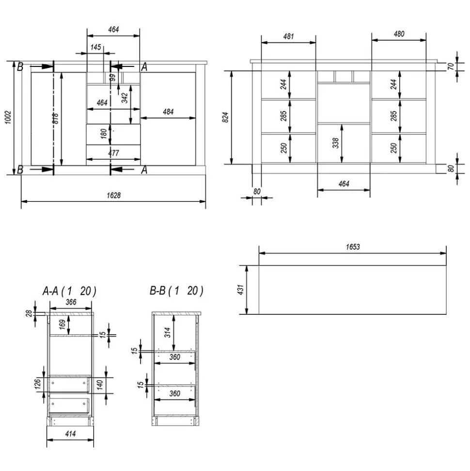 Mit den Maßen 166 cm in der Breite, 100 cm in der Höhe und 44 cm in der Tiefe ist das Sideboard „Buleta“ ein wahres Raumwunder. Das zentrale offene Fach, ideal dimensioniert mit 46x34x36 cm, bietet perfekten Platz für Ihre Lieblingsstücke oder alltägliche Notwendigkeiten. Darüber hinaus bereichern drei speziell konzipierte Fächer für Flaschen – jedes 14x9x36 cm groß – den Stauraum und halten Ihre Getränke stets griffbereit. Nicht zu vergessen sind die zwei Schubladen mit den Innenmaßen von je 40x12x30 cm, ausgestattet mit Metallauszügen für eine leichte und geräuscharme Bedienung. Die Türen, veredelt mit hochwertigen Metallbeschlägen, verbergen je zwei Einlegeböden, die zusätzlichen Stauraum für alles bieten, was außer Sicht bleiben soll.
