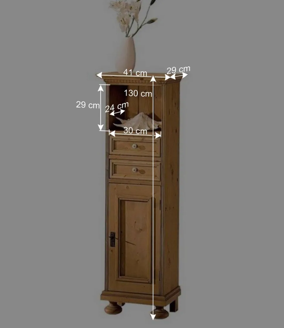 Mit ihren Maßen von 41 cm in der Breite, 130 cm in der Höhe und 29 cm in der Tiefe findet die „Melessa“ auch in der kleinsten Nische noch einen Platz. Doch lassen Sie sich von den kompakten Abmessungen nicht täuschen – diese Hochkommode bietet jede Menge Stauraum! Hinter der abschließbaren Drehtür in Kassettenoptik befindet sich ein großes Staufach ohne Inneneinteilung, ideal für Ihre persönlichen Schätze. Zusätzlich stehen Ihnen zwei Schubkästen mit Holzauszug zur Verfügung, die mit nostalgischen weißen Porzellanknöpfen verziert sind. Darüber hinaus bietet das offene Fach oberhalb der Schubkästen weitere Möglichkeiten zur Aufbewahrung. Die aufwändige Paneeloptik der Rückwand verleiht der „Melessa“ das gewisse Etwas.
