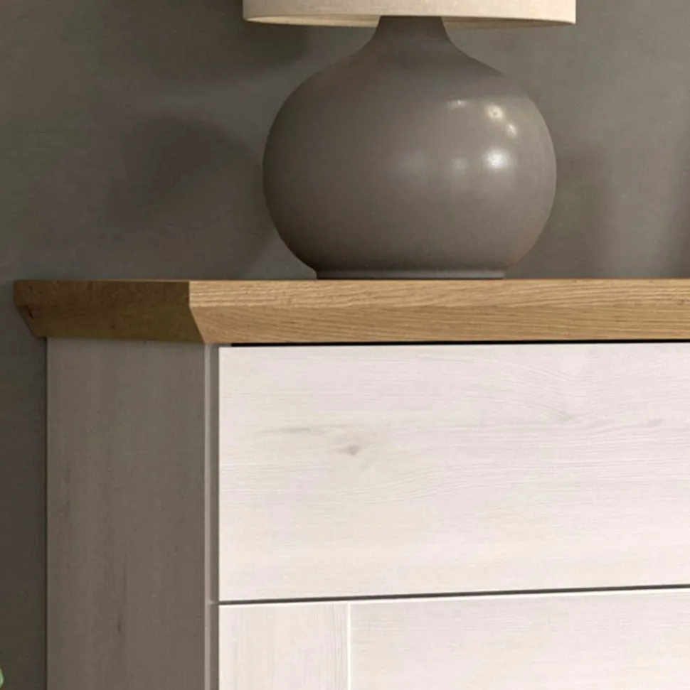 Die „Tocella“ Schuhkommode verbindet funktionalen Stauraum mit einem eleganten Design im Landhausstil. Mit einer Breite von 95 cm, einer Höhe von 92 cm und einer Tiefe von 39 cm fügt sie sich harmonisch in Ihr Zuhause ein. Die Kombination aus Holzoptik Lärche Weiß und Absetzungen in Wildeichefarben sorgt für ein warmes, einladendes Ambiente in Ihrem Flur oder Eingangsbereich.